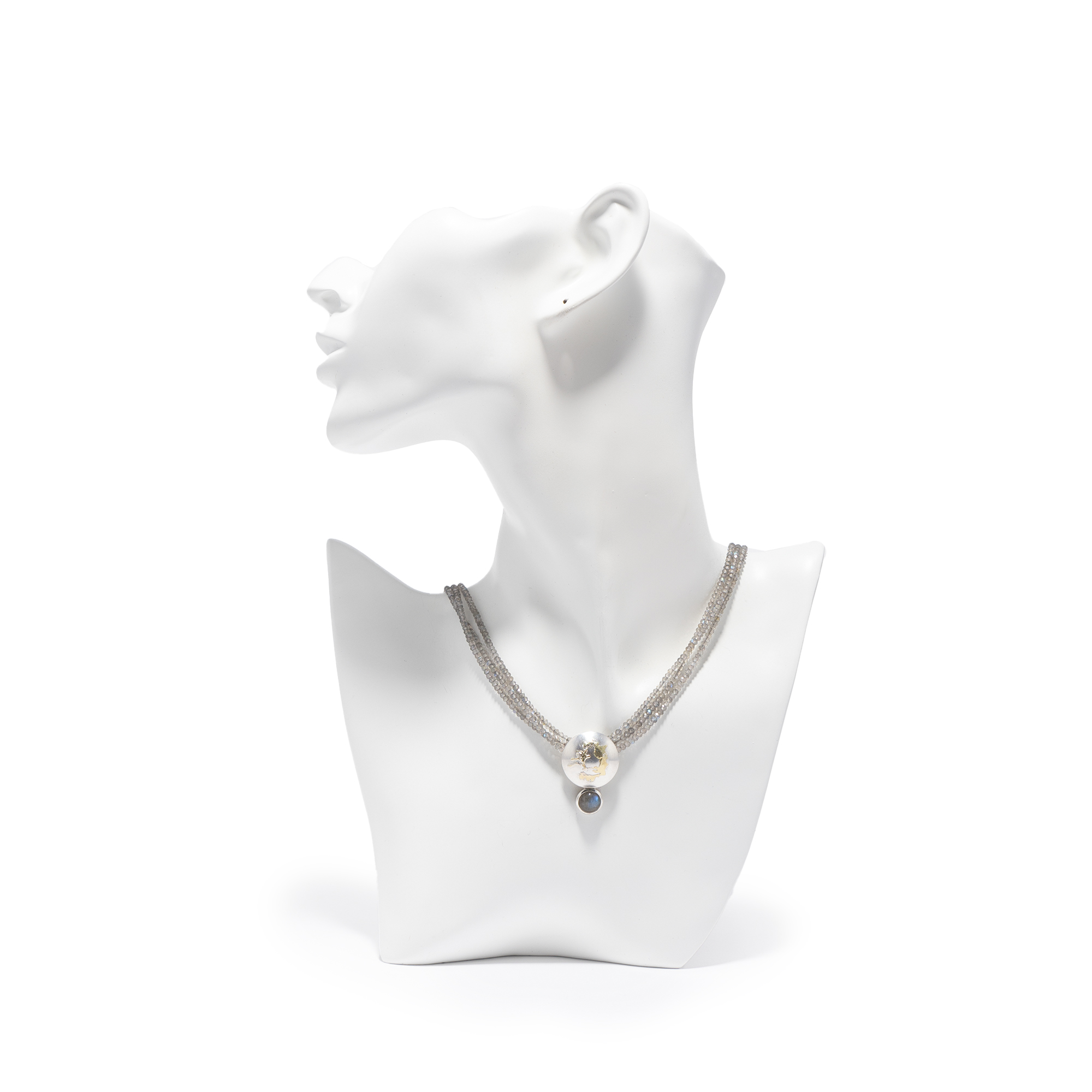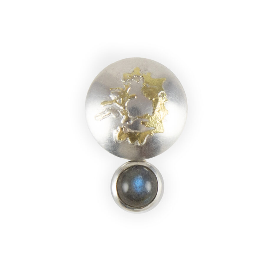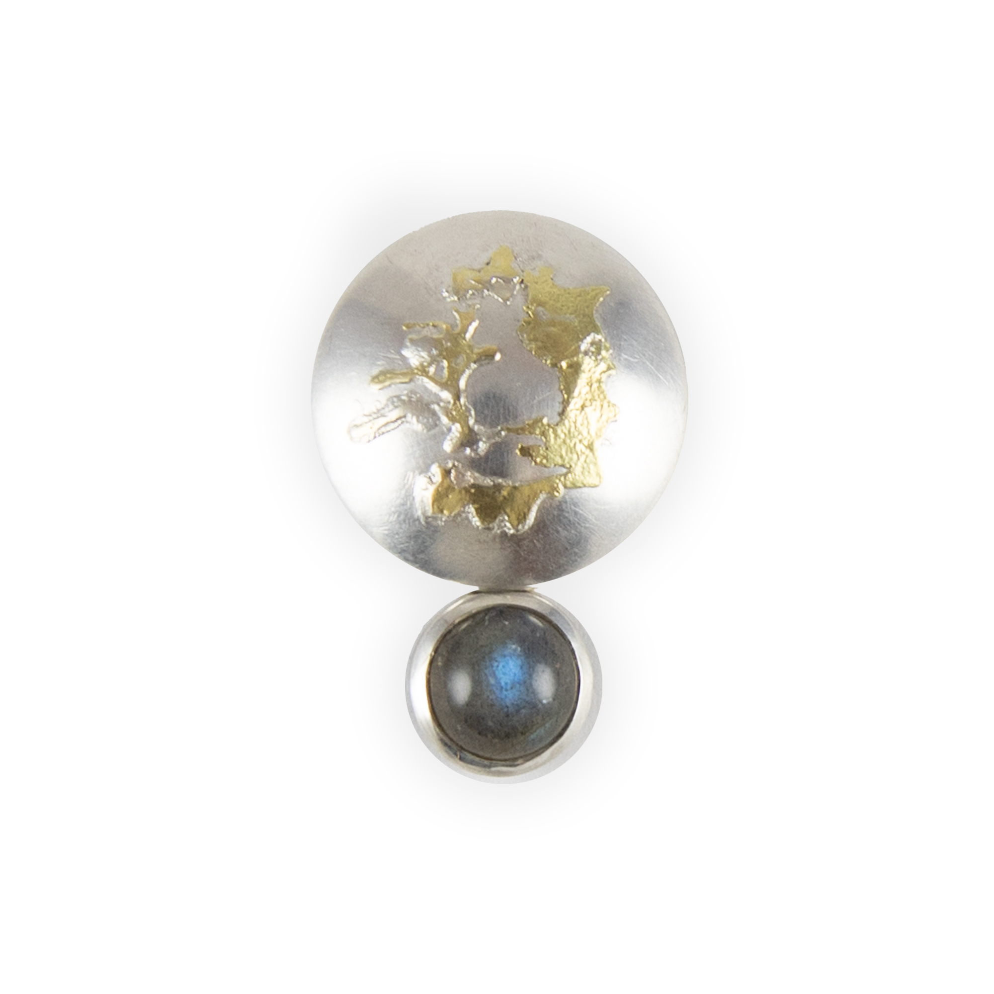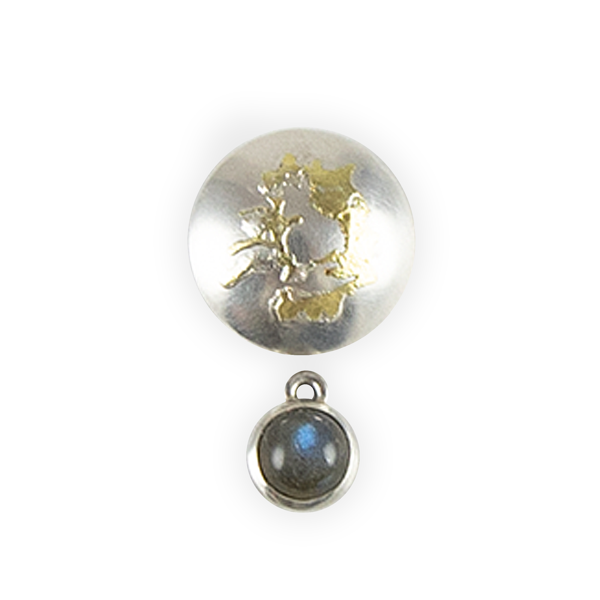 Dieser klassische Silberanhänger ist aus einer konvex gewölbten Kreisscheibe von etwa 20 mm Durchmesser gearbeitet, die mit strukturiertem 750er Gold belötet wurde. Bei dem Einhänger handelt es sich um einen runden Labradorith im Cabochonschliff, von etwa 8mm Durchmesser, der in Silber gefasst wurde. Er ist an einem auf der Rückseite es Anhängers befindlichen Haken befestigt und kann abgenommen werden. So lässt sich der Anhänger auch solo tragen, oder mit anderen Einhängern kombinieren. Die Anhängerschlaufe auf der Rückseite hat einen Durchlass von ca. 3,5 mm. Auf der Büste sehen Sie den Anhänger an einer dreireihigen Kette aus facettierten Labradorithrondellen, mit der zusammen er ein wunderschönes Collier bildet. Diese Kette ist nicht im Lieferumfang enthalten und kann separat bei mir erworben werden.