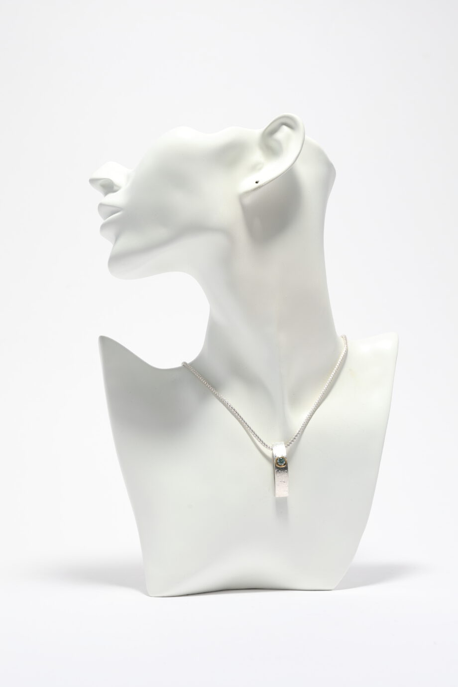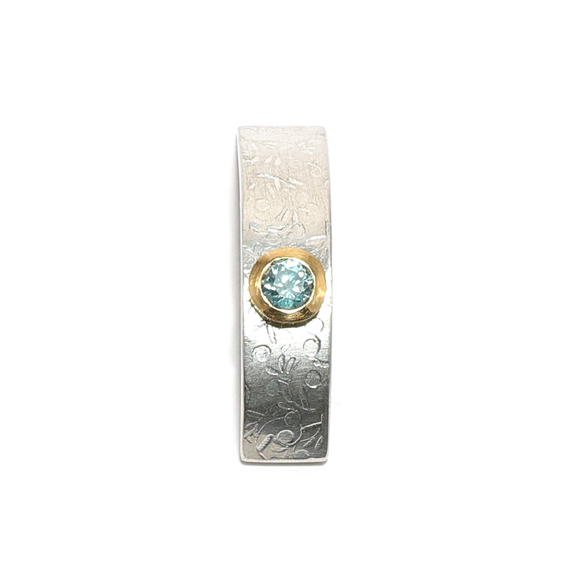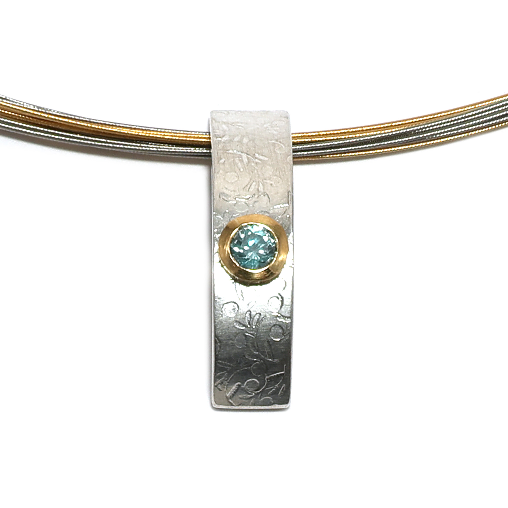 Dieser alltagstaugliche und kombinationsfreudige Anhänger ist aus strukturiertem Sterlingsilber, in Kombination mit 750er Gelbgold gearbeitet. Im optischen Zentrum befindet sich ein runder, facettierter türkisblauer Zirkon mit ca. 4,5 mm Durchmesser, eingefasst in Gold. Zirkone sind natürliche Edelsteine mit einer hohen Brillanz. Tatsächlich handelt es sich dabei um eines der ältesten Mineralien des Planeten Erde. Der Anhänger ist in Form eines Bogens gestaltet, misst etwa 31,5 mm x 7,5 mm und kann in zwei Richtungen getragen werden. So ergibt sich ein Kettendurchlass von ca. 4 mm und ein weiterer von etwa 6,5 mm. Hier sehen Sie das Schmuckstück beispielhaft an einem Halsreif aus Edelstahl bicolor und an einer Silberkette. Diese sind nicht im Lieferumfang enthalten und können separat bei mir erworben werden.