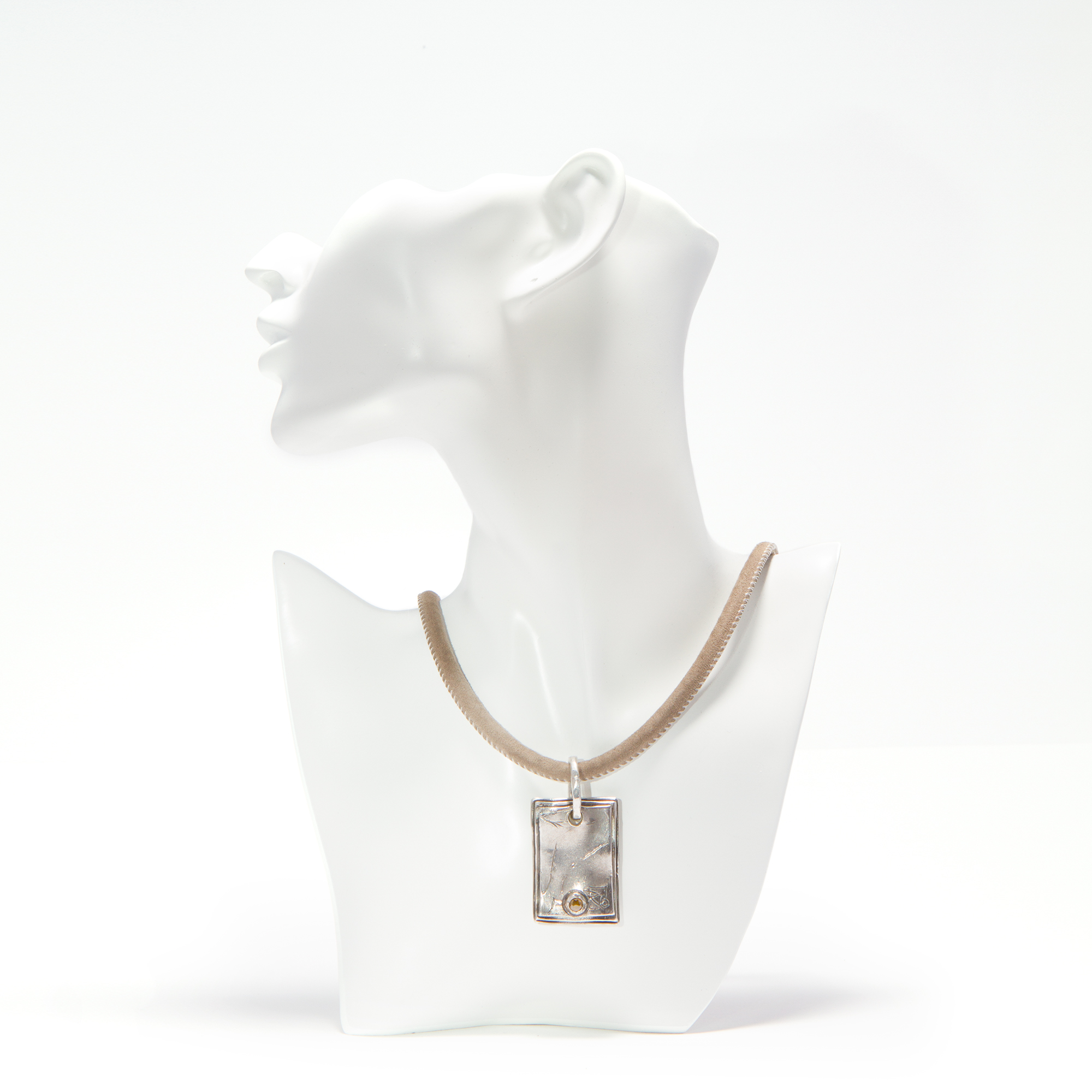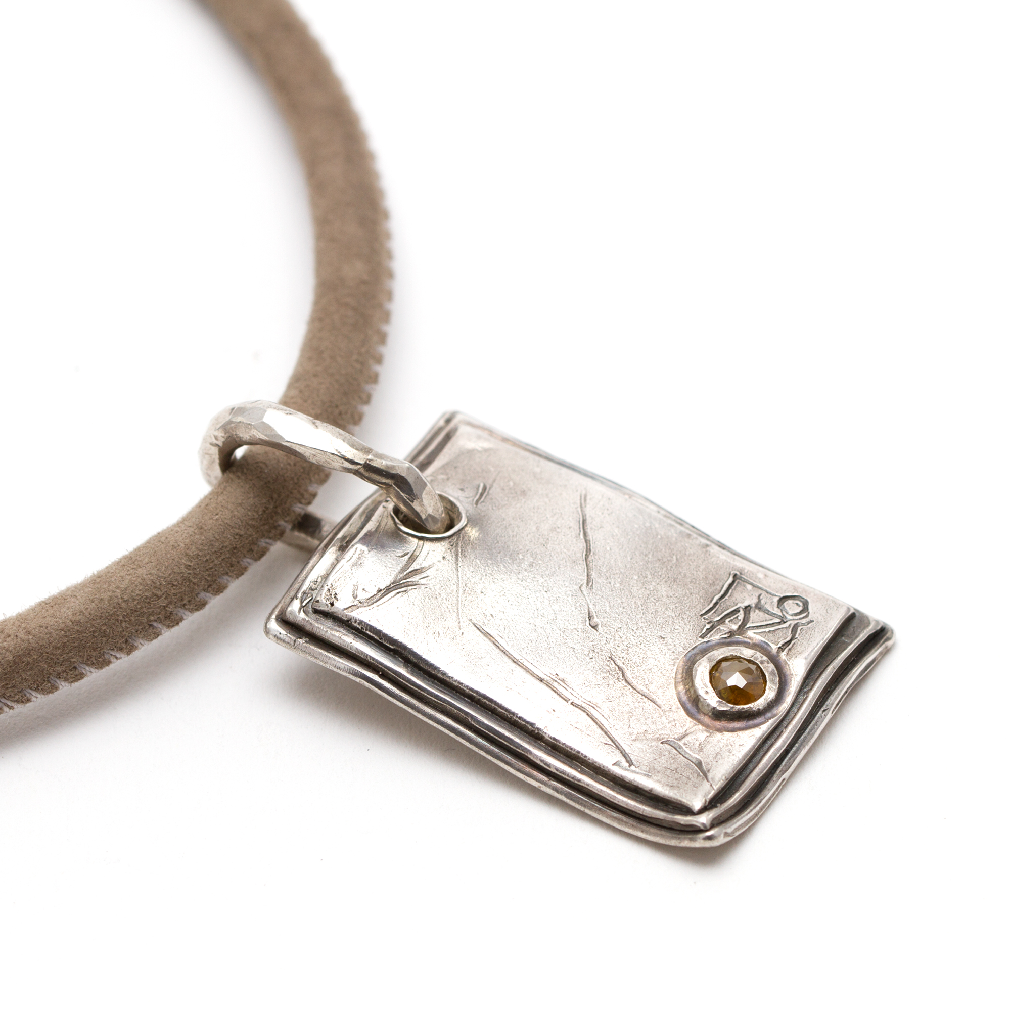 Dieser rustikale Anhänger aus massivem Sterlingsilber wiegt ca. 35 Gramm und ist ein markantes Einzelstück. Er trägt, unmittelbar ins Silber gefasst, einen gelben Diamanten im Rosenschliff, mit einem Durchmesser von etwa 4 mm, der ihm das gewisse Etwas verleiht. Die Öse hat einen Durchlass von ca. 10 mm, so dass man den Anhänger auch an kräftigen Ketten und Bändern tragen kann. Hier sehen Sie ihn an einem 5 mm starken Band aus sandfarbenem, genähtem Veloursleder. Dieses Band ist nicht im Lieferumfang enthalten.