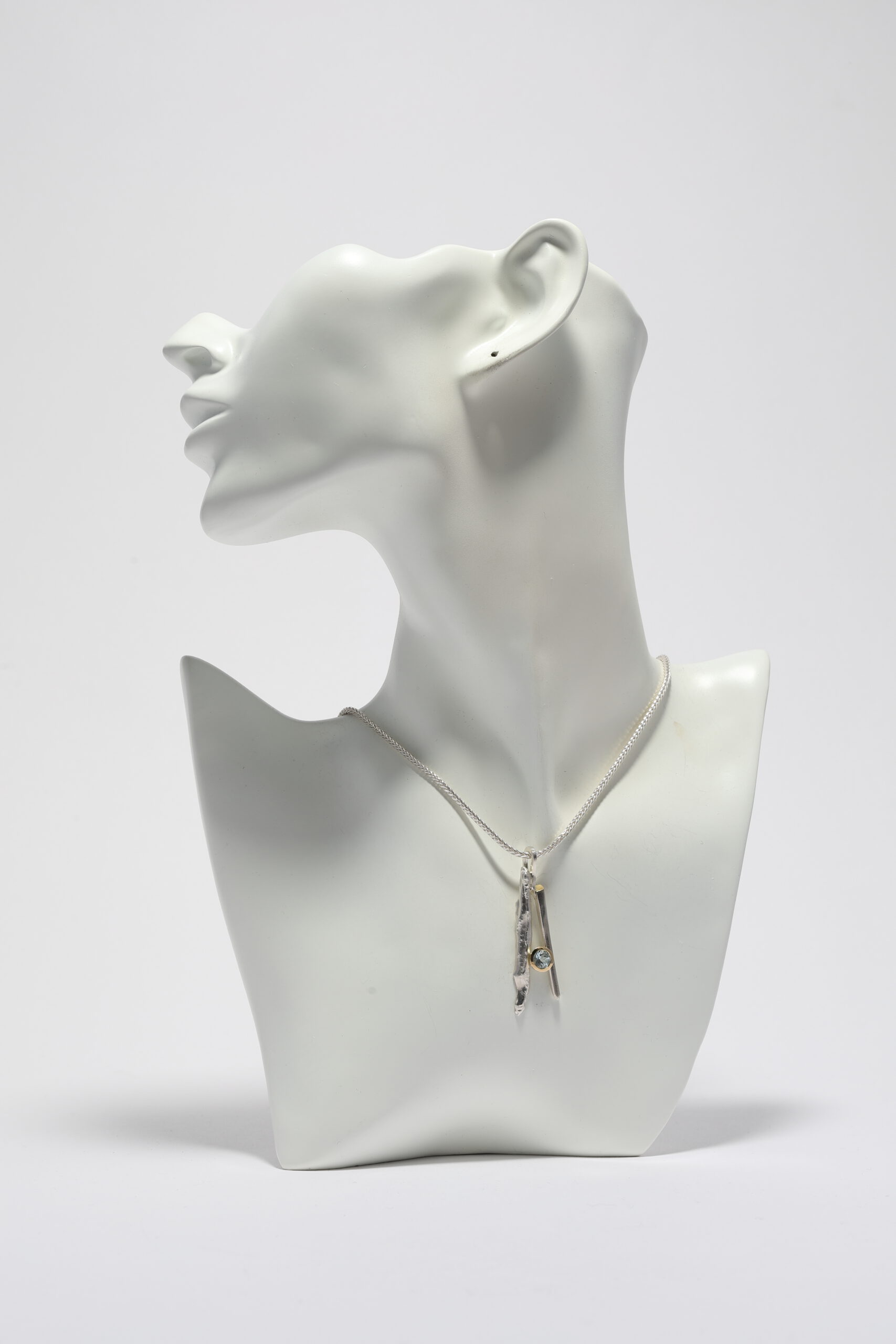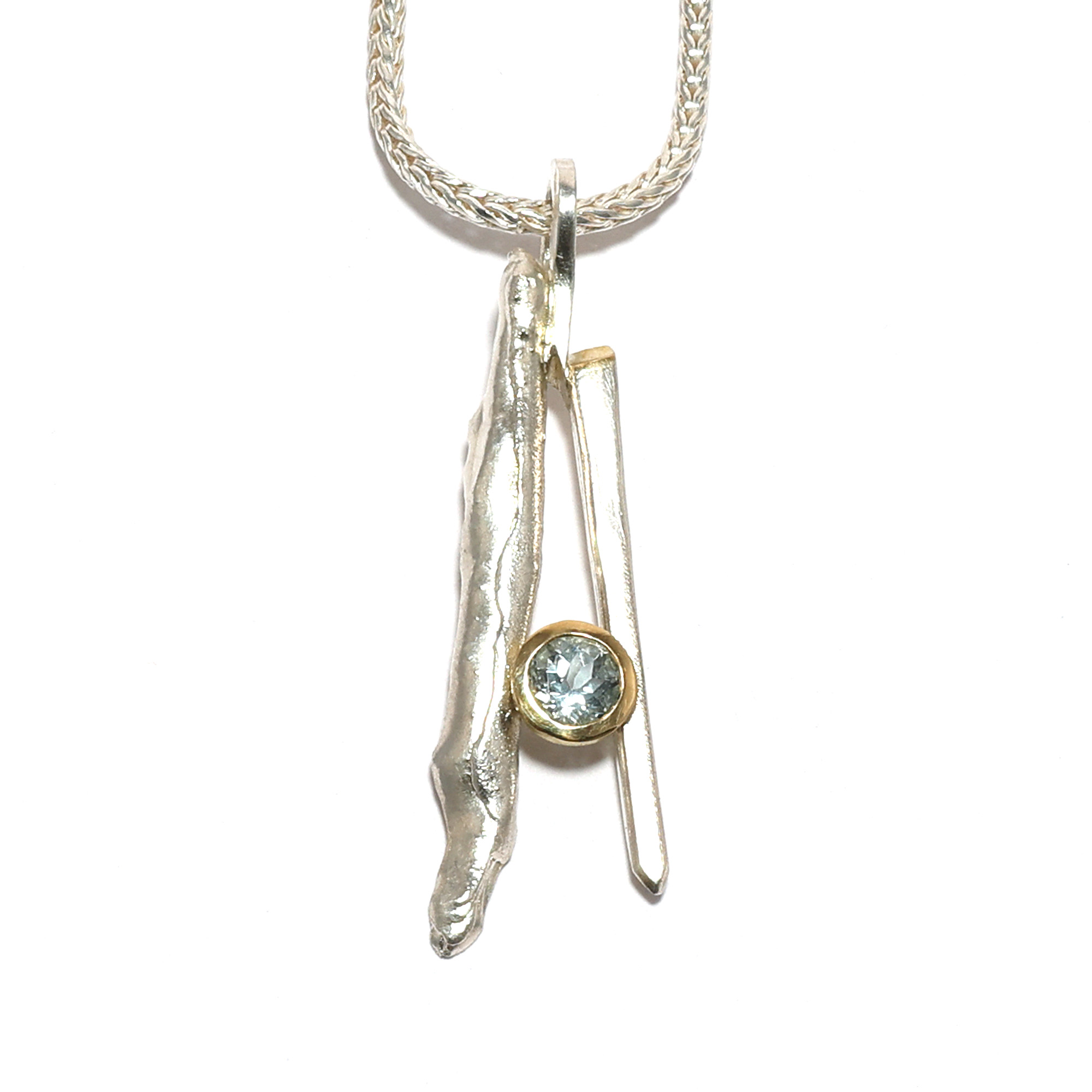 Dieser Anhänger ist aus Sterlingsilber, in Kombination mit 750er Gelbgold gearbeitet. Im optischen Zentrum befindet sich ein runder, facettierter Aquamarin mit ca. 5,5 mm Durchmesser, eingefasst in Gold. Der betont handwerkliche Duktus und das Zusammenspiel freier Formen gibt diesem individuellen Schmuckstück einen unbekümmerten, spielerischen Charakter. Der Anhänger misst etwa 47 mm x 14 mm und hat einen Kettendurchlass von etwa 5 mm Durchmesser. Hier sehen Sie ihn beispielhaft an einer Silberkette. Diese ist nicht im Lieferumfang enthalten und kann separat bei mir erworben werden.