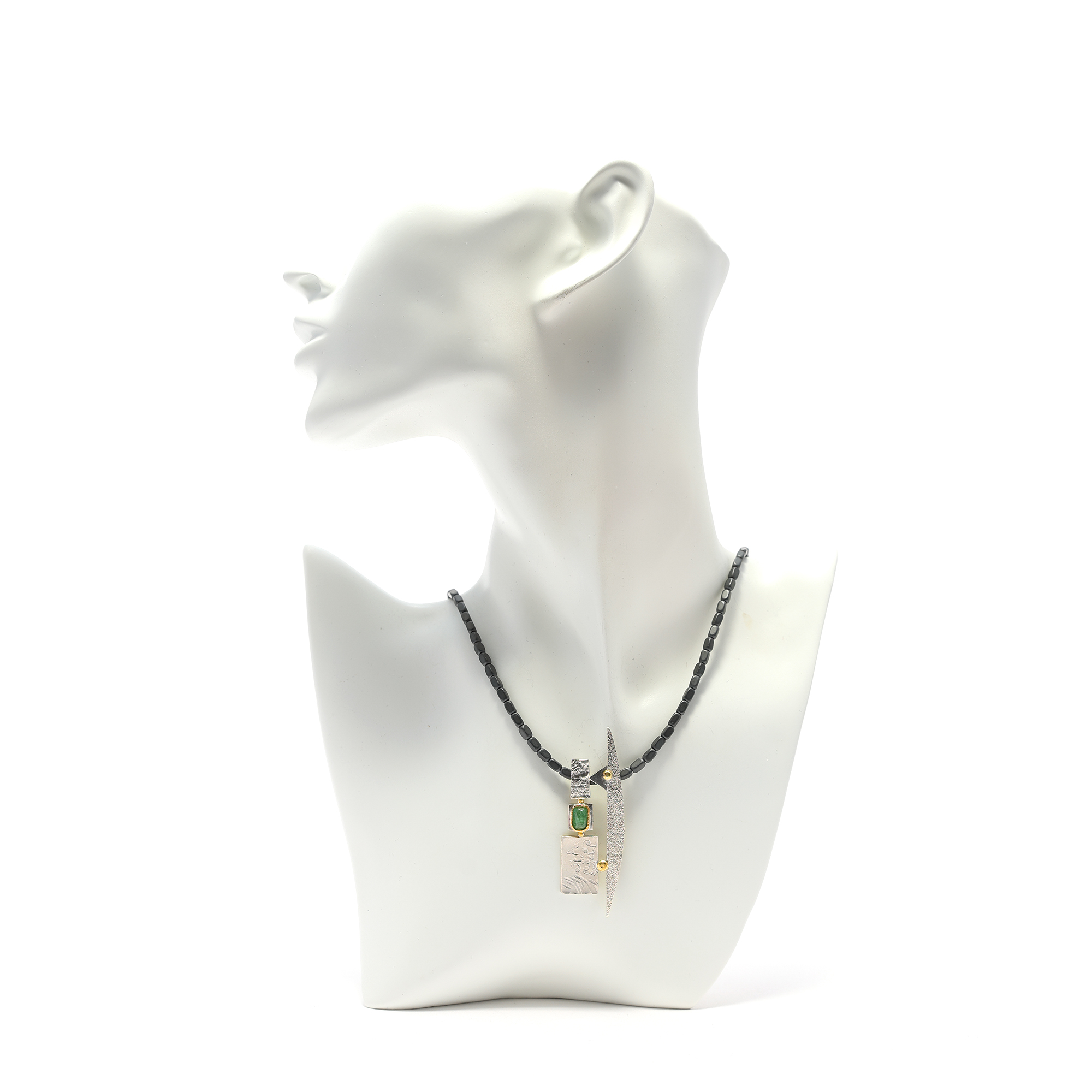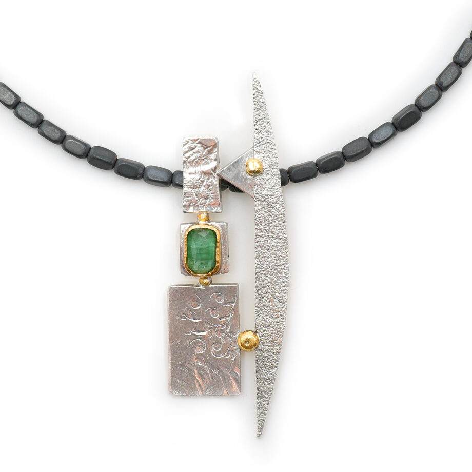Dieser Anhänger ist aus unterschiedlich strukturiertem Sterlingsilber, in Kombination mit 900er Gelbgold gearbeitet. Etwa mittig befindet sich ein türkisgrüner Turmalin, eingefasst in Gold. Der betont handwerkliche Duktus und das Zusammenspiel freier Formen gibt diesem individuellen Schmuckstück einen unbekümmerten, spielerischen Charakter. Der Anhänger misst etwa 61 mm x 20 mm und hat einen verdeckten Kettendurchlass von etwa 4 mm Durchmesser. Hier sehen Sie ihn beispielhaft an einer Kette aus 3 mm breiten, matten Hämatitquadern. Diese ist nicht im Lieferumfang enthalten und kann separat bei mir erworben werden.