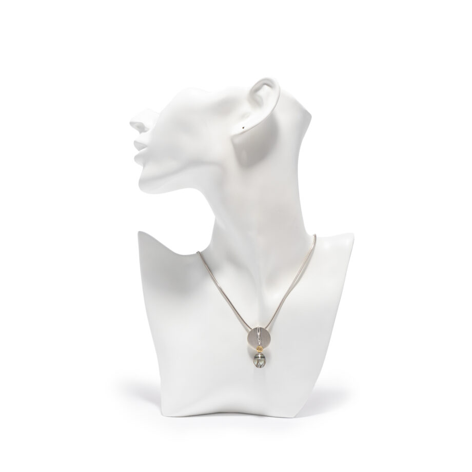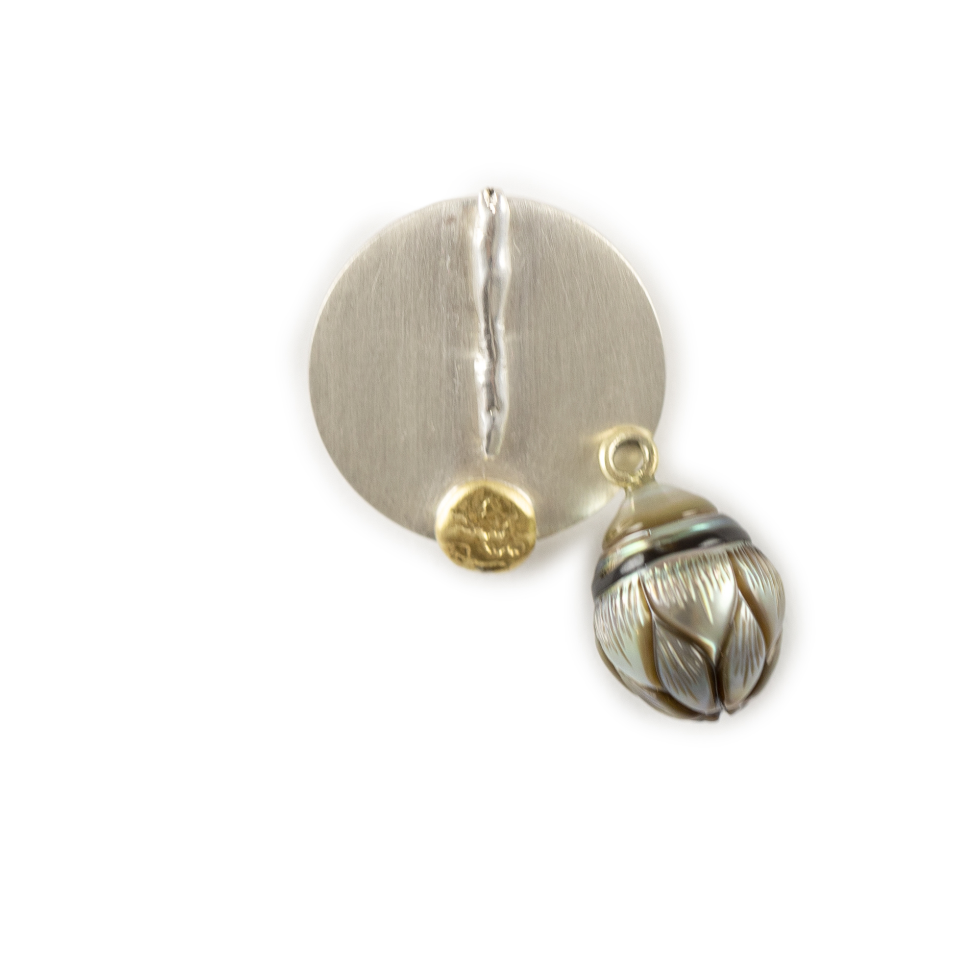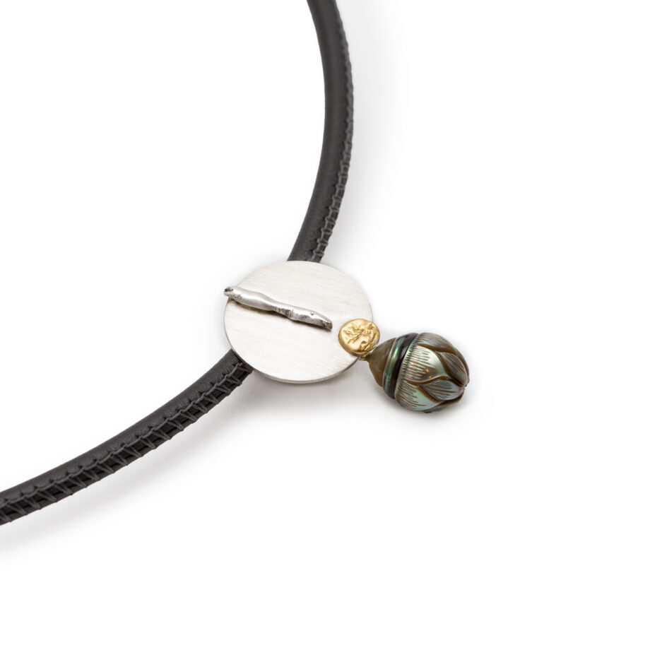 Dieser außergewöhnliche Anhänger aus Sterlingsilber und Gold ist mit einer gravierten Tahitiperle bestückt. Dazu wird in die Außenhaut der Perle vertieft ein Motiv eingraviert, in diesem Fall eine wunderschöne, florale Blütenkomposition. Auf der Rückseite des Anhängers befindet sich ein Haken, in dem die Perle mit einer Goldöse eingehangen wird und abgenommen werden kann. So kann der Anhänger auch solo getragen, oder mit anderen Einhängern variiert werden. Der Anhänger hat einen Durchmesser von ca. 19 mm und die tropfenförmige Perle hat etwa die Maße von 13,5mm x 10 mm. Der auf der Rückseite befindliche Kettendurchlass misst innen etwa 5 mm.
