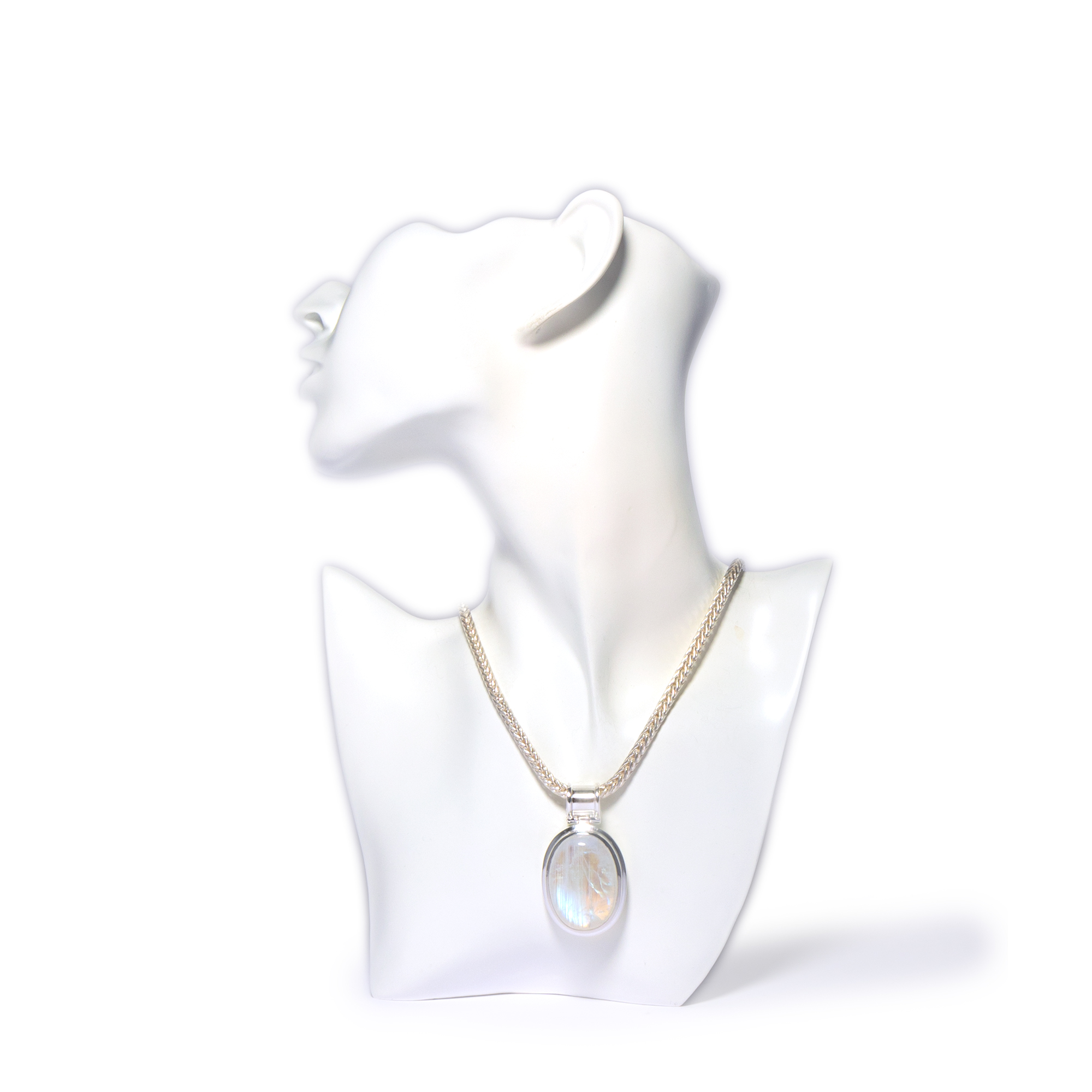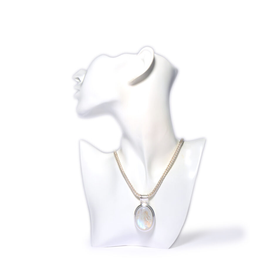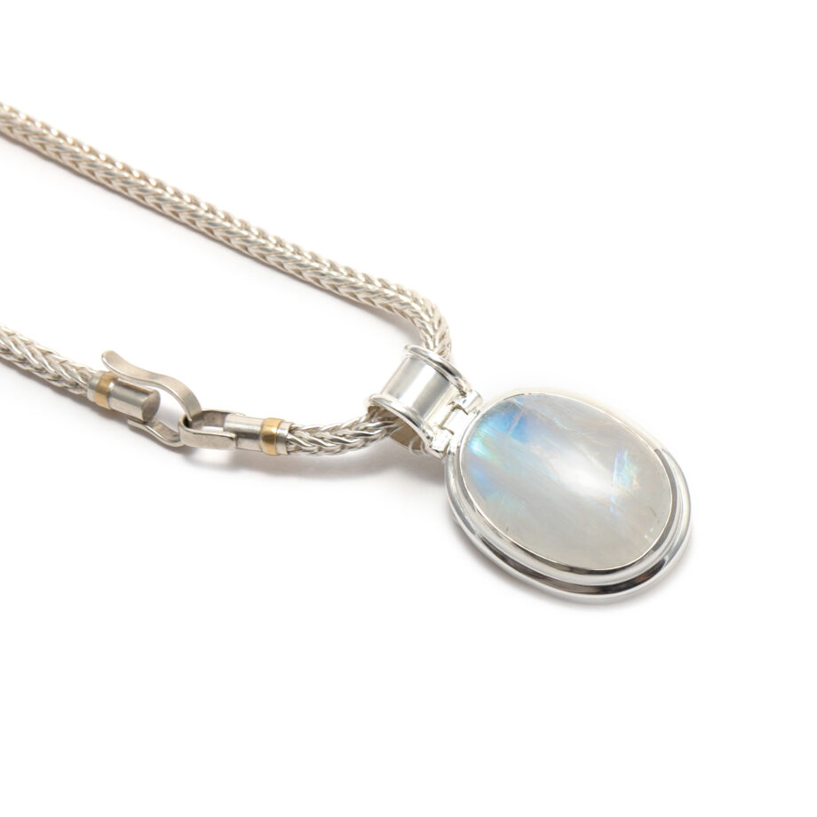 Dieser klar gestaltete Anhänger ist aus Sterlingsilber gearbeitet. Der Star ist ein großer, ovaler Regenbogenmondstein im Cabochonschliff. Die spezielle Einschlusslage des Edelsteines erzeugt eine Vielzahl von optischen Erscheinungen und macht ihn zu einer charakterstarken unikaten Persönlichkeit mit schönen, regenbogenfarbenen Effekten. Der Anhänger hat insgesamt eine Größe von ca. 50 mm x 29 mm, der Ösendurchlass beträgt etwa 9 mm. Hier sehen Sie den Anhänger beispielhaft an einer Fuchsschwanzkette aus Sterlingsilber, mit einem Durchmesser von 4 mm und einer von mir handgearbeiteten Schließe aus Silber und 750er Gold. Diese Kette ist nicht im Lieferumfang enthalten.
