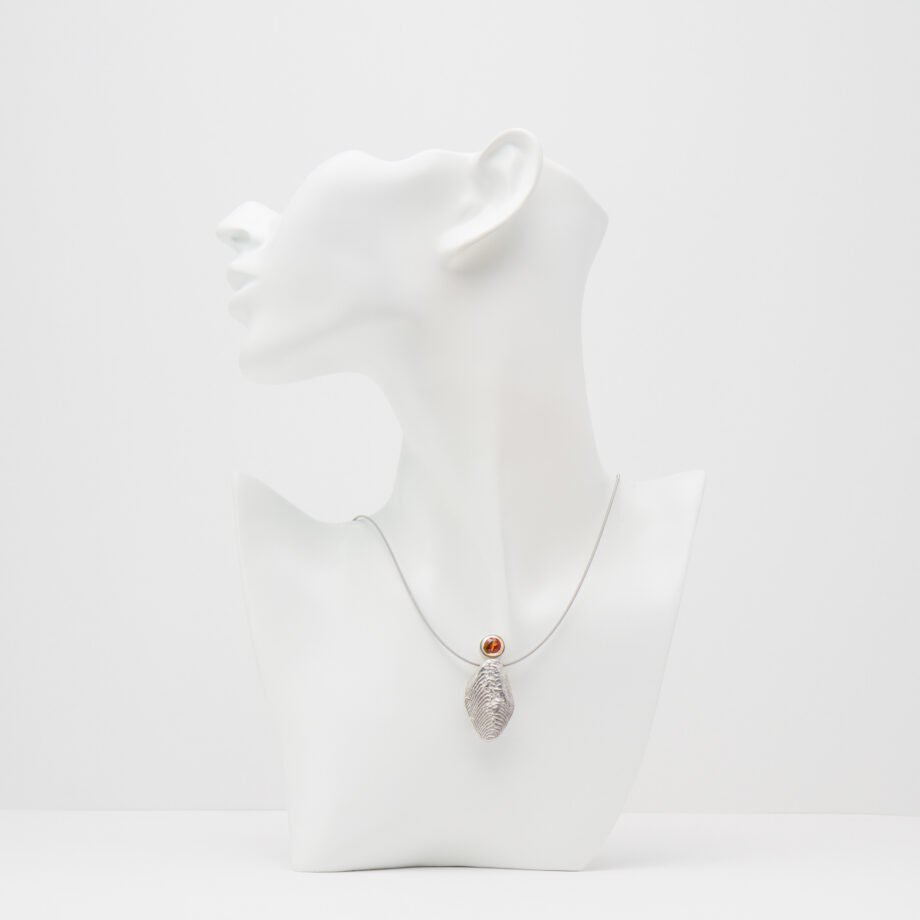 Dieser organisch gestaltete Anhänger ist aus massivem Sterlingsilber gearbeitet. Seine wellenartige Linienstruktur auf der Oberfläche erinnert an einen Strandspaziergang am Meer. Der wunderschöne, natürliche Zirkon von 1,2 ct., – nicht zu verwechseln mit Zirkonia -, gefasst in 750er Gold, strahlt darüber in einem leuchtenden, warme Orange, wie eine über dem Horizont aufgehende Sonne. Der Anhänger misst ca. 40 mm x 18 mm, der Kettendurchlass hat eine Größe von etwa 3,5 mm. Hier sehen Sie den Anhänger beispielhaft an unterschiedlichen Stahlseilreifen. Diese sind nicht im Lieferumfang enthalten.