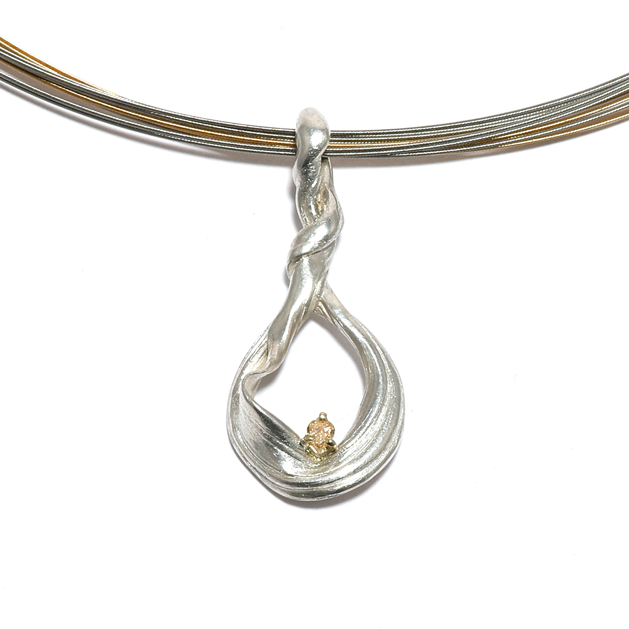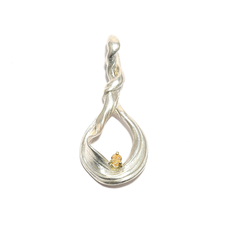 Bei diesem organisch gestalteten Anhänger aus massivem Sterlingsilber wurde eine alte japanische Technik verwendet, die eine feine Linienstruktur auf der Oberfläche und eine anmutige Faltung erzeugt. Im optischen Zentrum, zart eingefasst in 585er Gold, befindet sich ein natürlicher, champagnerfarbener Diamant im Tropfenschliff, von ca. 0,13 ct, der diesem Schmuckstück das warme Licht gibt. Der Anhänger misst ca. 44 mm x 19 mm, der Kettendurchlass hat eine Größe von etwa 4 mm. Hier sehen Sie ihn beispielhaft an einem mehrreihigen, zweifarbigem Edelstahlreif. Dieser ist nicht im Lieferumfang enthalten und kann separat bei mir erworben werden.