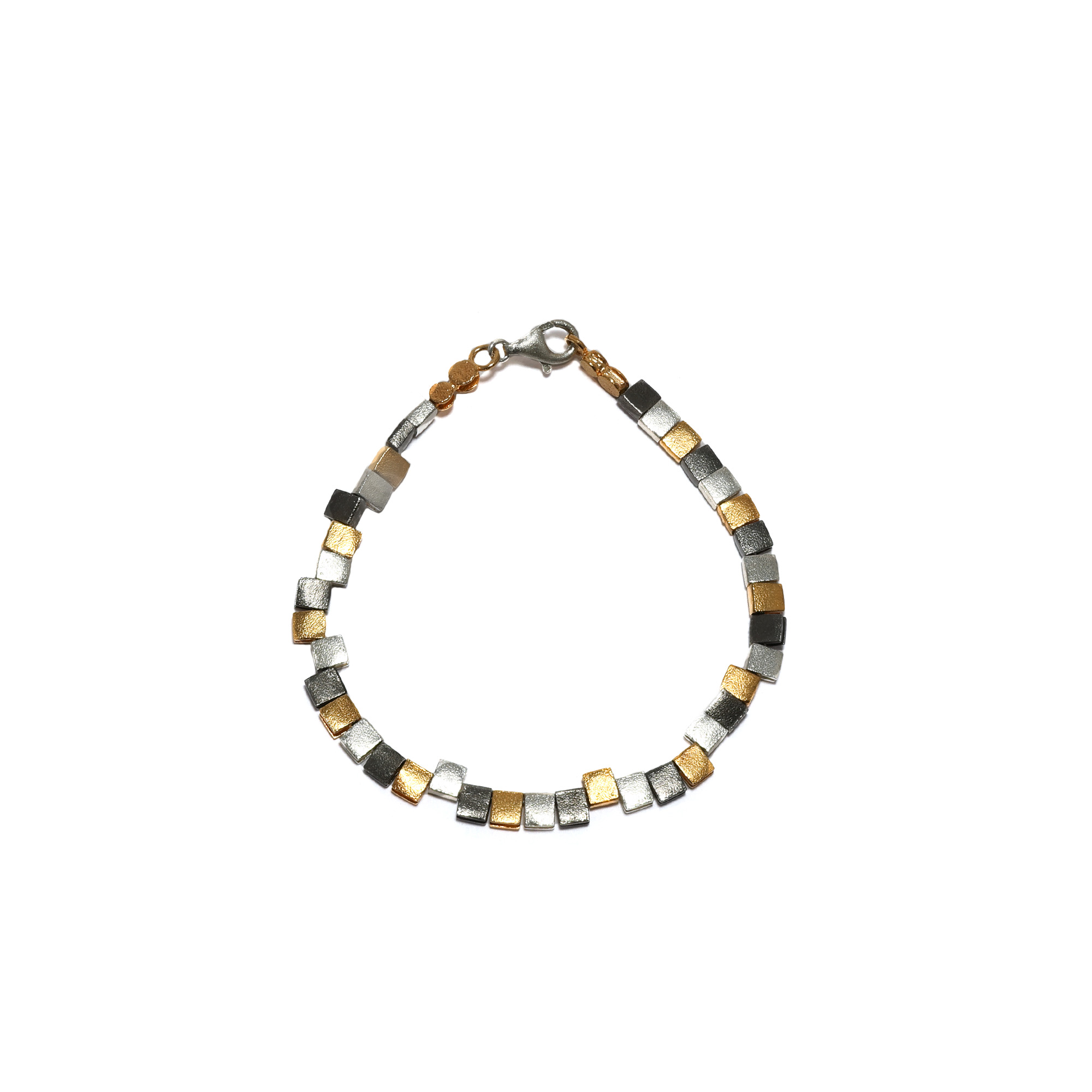 Dieses Armband aus Sterlingsilber besteht aus kleinen Quadraten mit ca. 4,5 mm Kantenlänge. Sie sind abwechselnd silbern belassen, vergoldet und mittels Sulfidierung geschwärzt, wodurch die kombinationsstarke Dreifarbigkeit entsteht. Das Armband hat eine Länge von ca. 19,5 cm und passt zu nahezu jeder Garderobe und Gelegenheit. Zu diesem Armband gibt es auch ein passendes Collier von ca. 45 cm Länge. Wenn man Collier und Armband ineinander hängt, erhält man eine Kette von etwa 65 cm Länge. Das Collier ist nicht im Lieferumfang enthalten und kann separat bestellt werden.