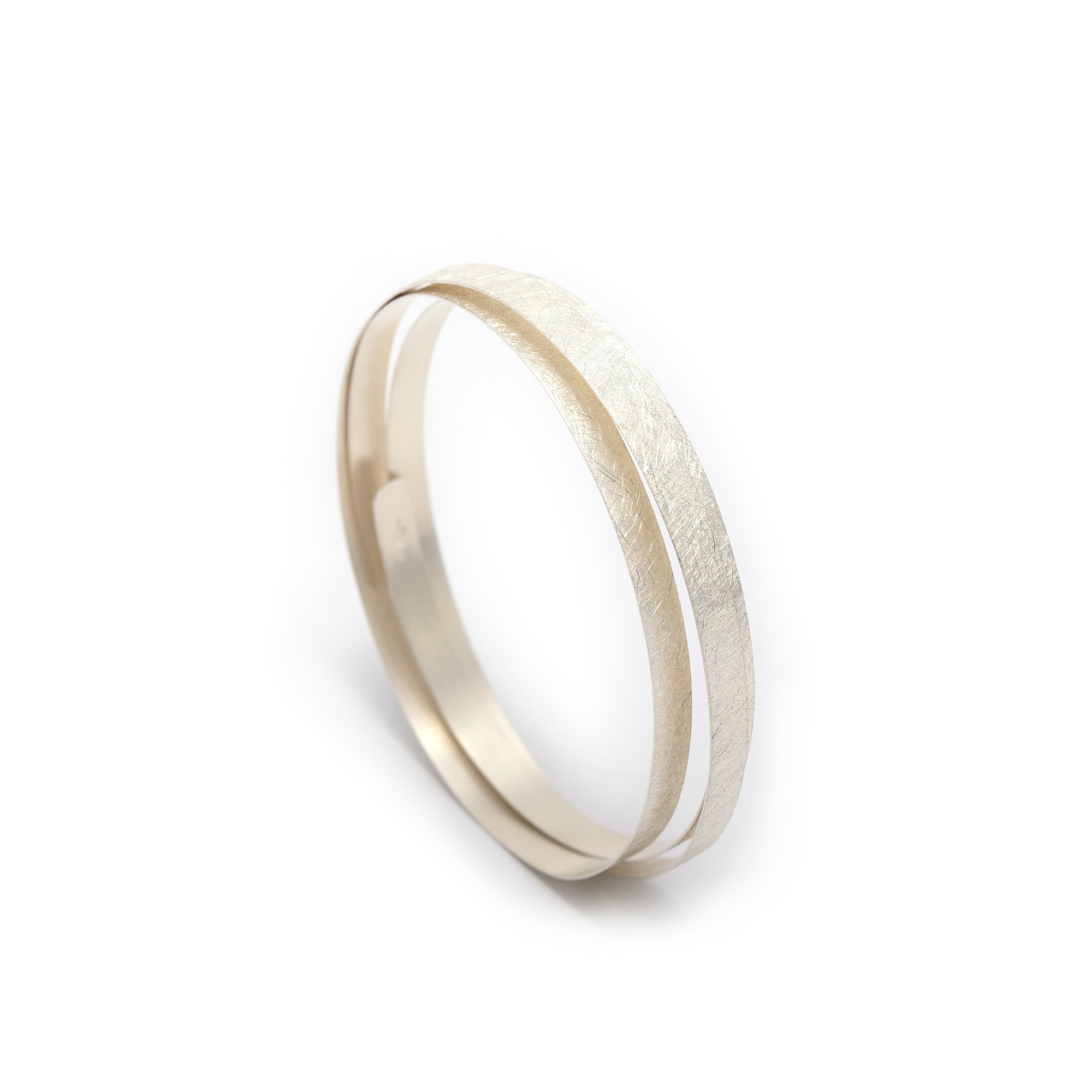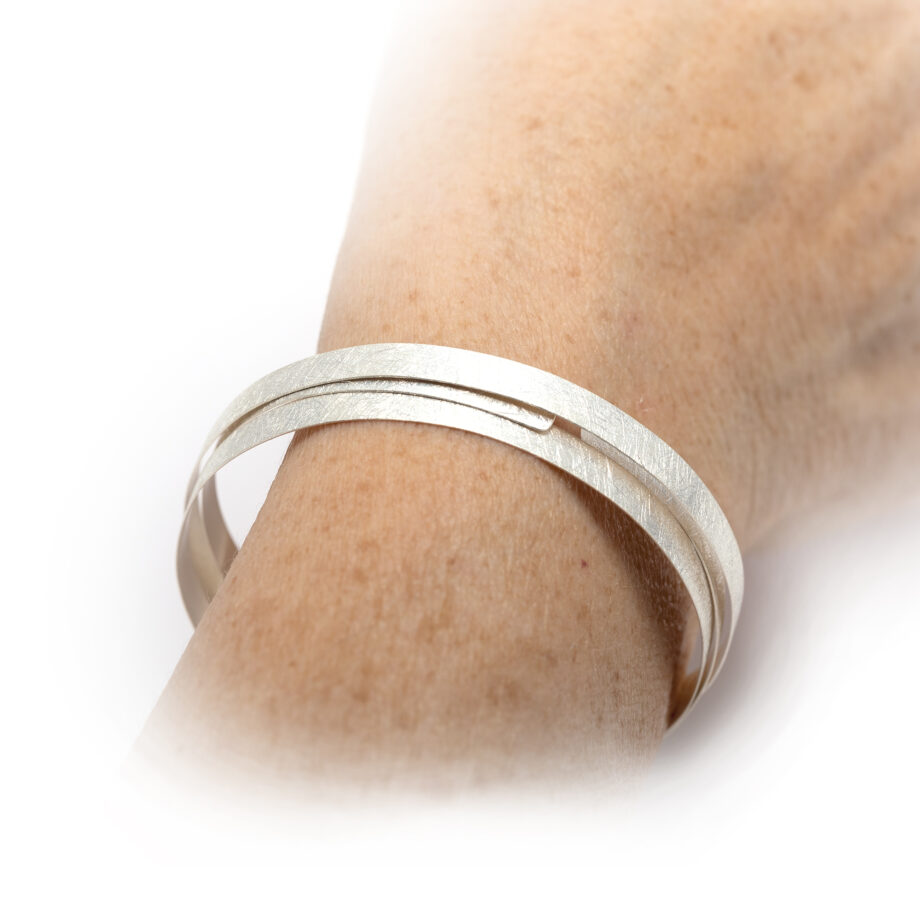 Dieser zauberhaft zarte und feminine Armreif ist ein idealer Begleiter für jeden Tag und jede Gelegenheit. Er ist aus einem federhart gewalzten Silberband gearbeitet, das etwa 5 mm breit und 0,5 mm stark ist, mit drei Windungen spiralig gewickelt und auf der Oberfläche eismatt gekratzt wurde. Durch seine spezielle Machart lässt er sich bequem anlegen und kommt ohne Verschluss aus. Gleichzeitig ist er wunderbar leicht und trotzdem sehr robust und alltagstauglich. Der Innendurchmesser des Reifens beträgt etwa 55 mm.