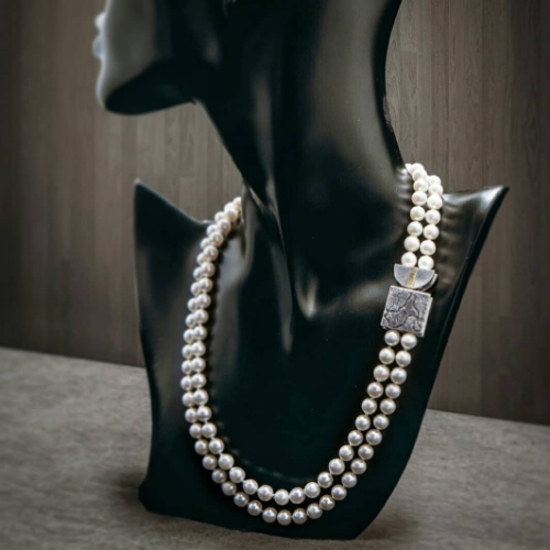Diese doppelreihige Zuchtperlenkette, mit außergewöhnlicher Schmuckschließe, entstand als Umarbeitung im Kundenauftrag.