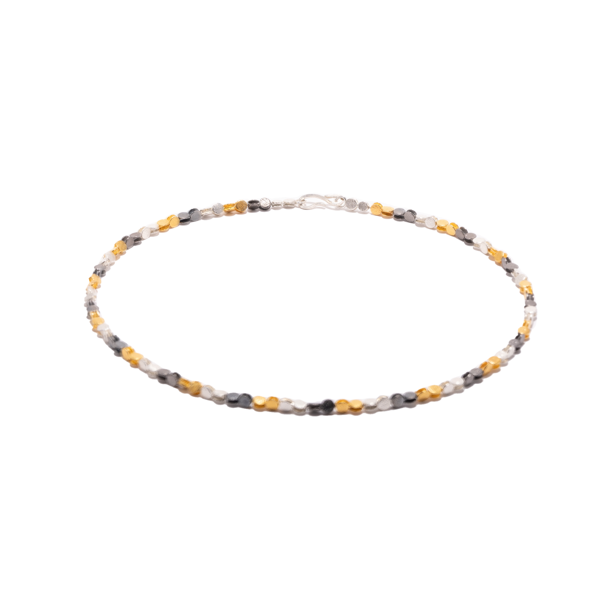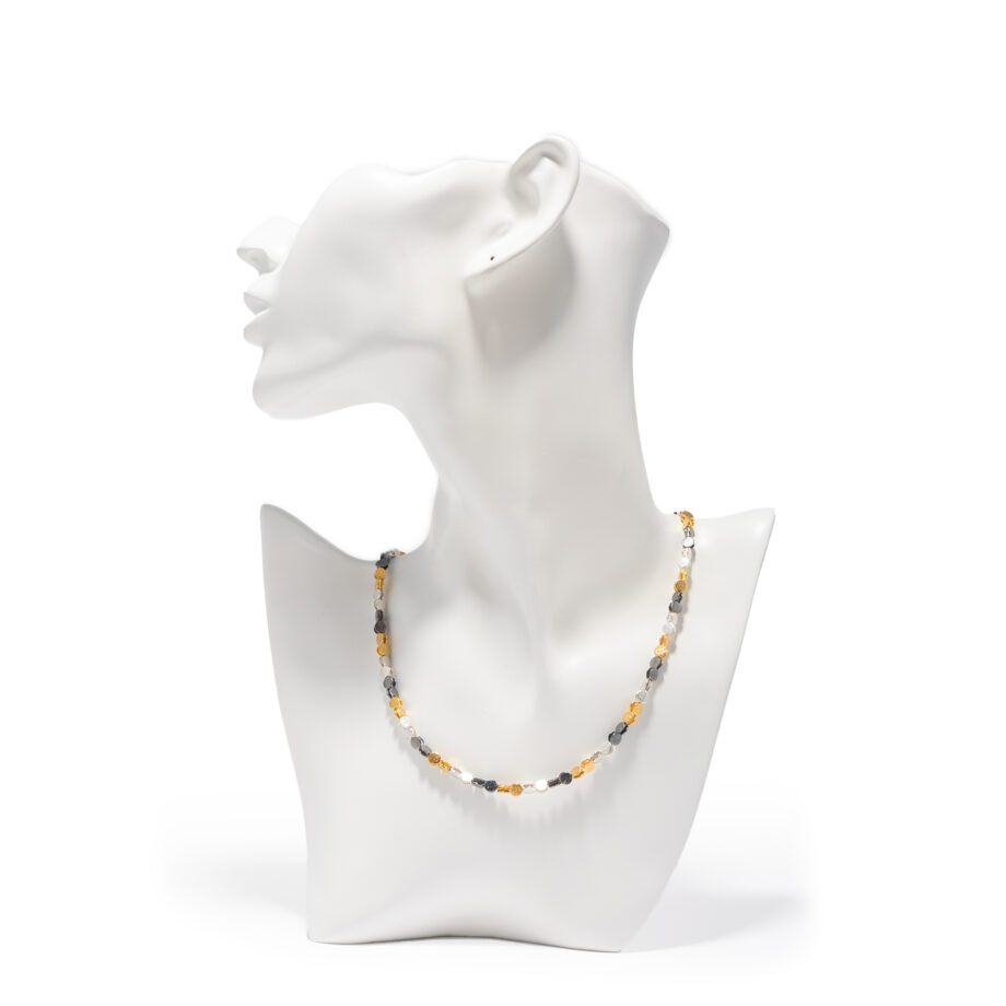 Dieses Collier aus Sterlingsilber besteht aus kleinen Kreisen mit ca. 4,5 mm Durchmesser. Sie sind abwechselnd silbern belassen, vergoldet und mittels Sulfidierung geschwärzt, wodurch die kombinationsstarke Dreifarbigkeit entsteht. Das Collier hat eine Länge von ca. 45 cm und passt zu nahezu jeder Garderobe und Gelegenheit. Zu dem Collier gibt es auch ein passendes Armband von ca. 19,5 cm Länge. Wenn man Collier und Armband ineinander hängt, erhält man eine Kette von etwa 65 cm Länge. Das Armband ist nicht im Lieferumfang enthalten und kann separat bestellt werden.