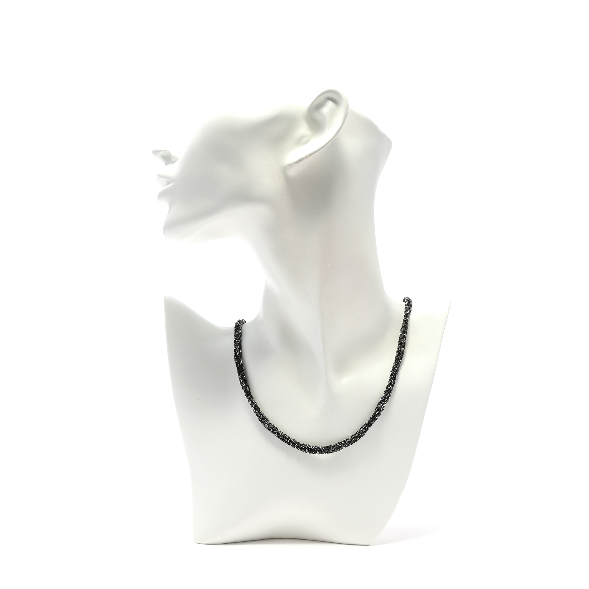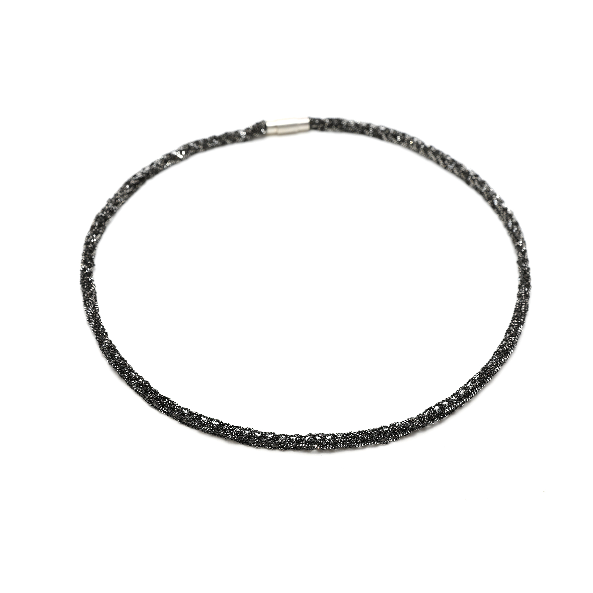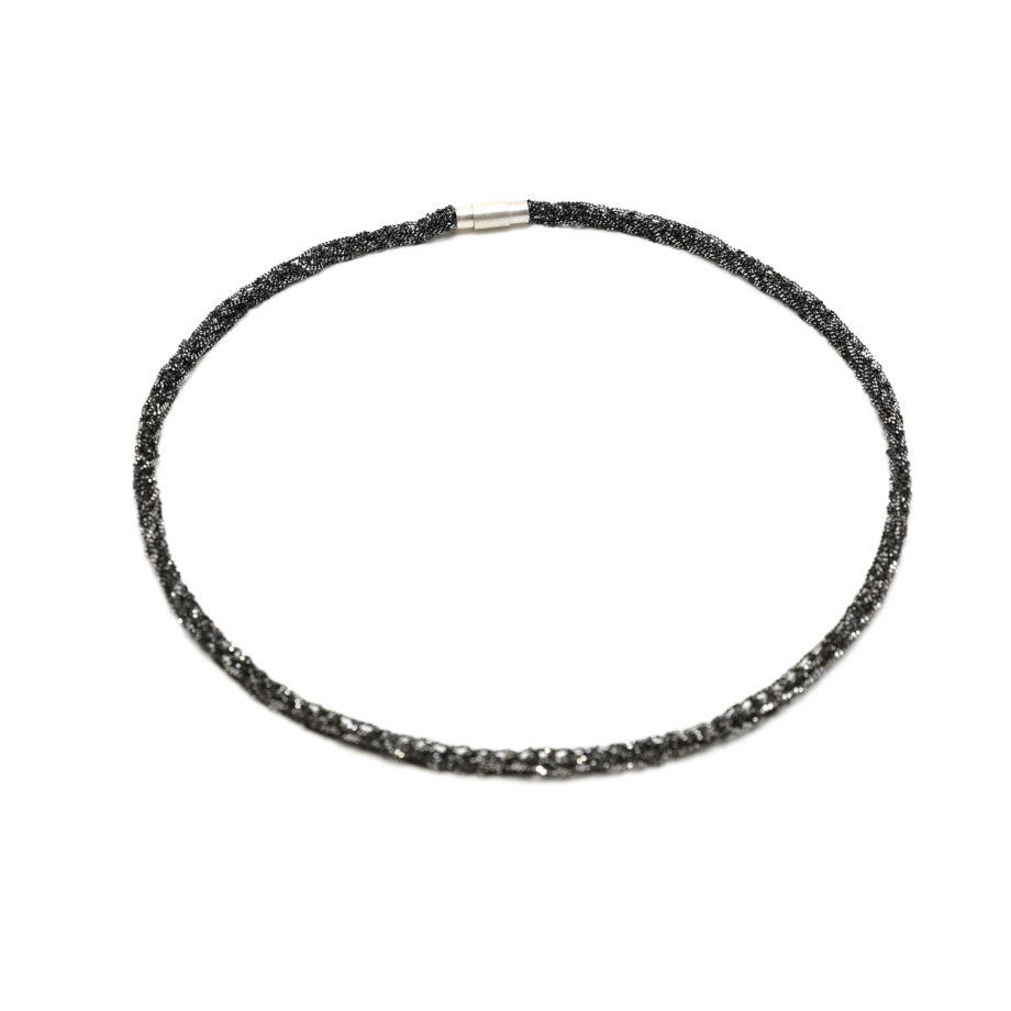 Dieses geheimnisvolle Collier aus ist aus feinen Silberketten gearbeitet die miteinander verwoben wurden. Anschließend wurde das Silber mittels Sulfidieren geschwärzt und dann mit einem diamantierten Werkzeug geschliffen, wodurch das intensive, Diamanten ähnliche Funkeln auf der Oberfläche entsteht. Die Kette hat einen Durchmesser von ca. 5 mm, eine Länge von knapp 45 cm und wiegt etwa 18 Gramm. Sie schmiegt sich weich an die Körperform, ist sehr angenehm in der Haptik und eignet sich auch, um einen Anhänger daran zu tragen. Der Verschluss schließt magnetisch und ist mittels einer Überlappung vor unbeabsichtigtem Öffnen durch Aufkanten geschützt.