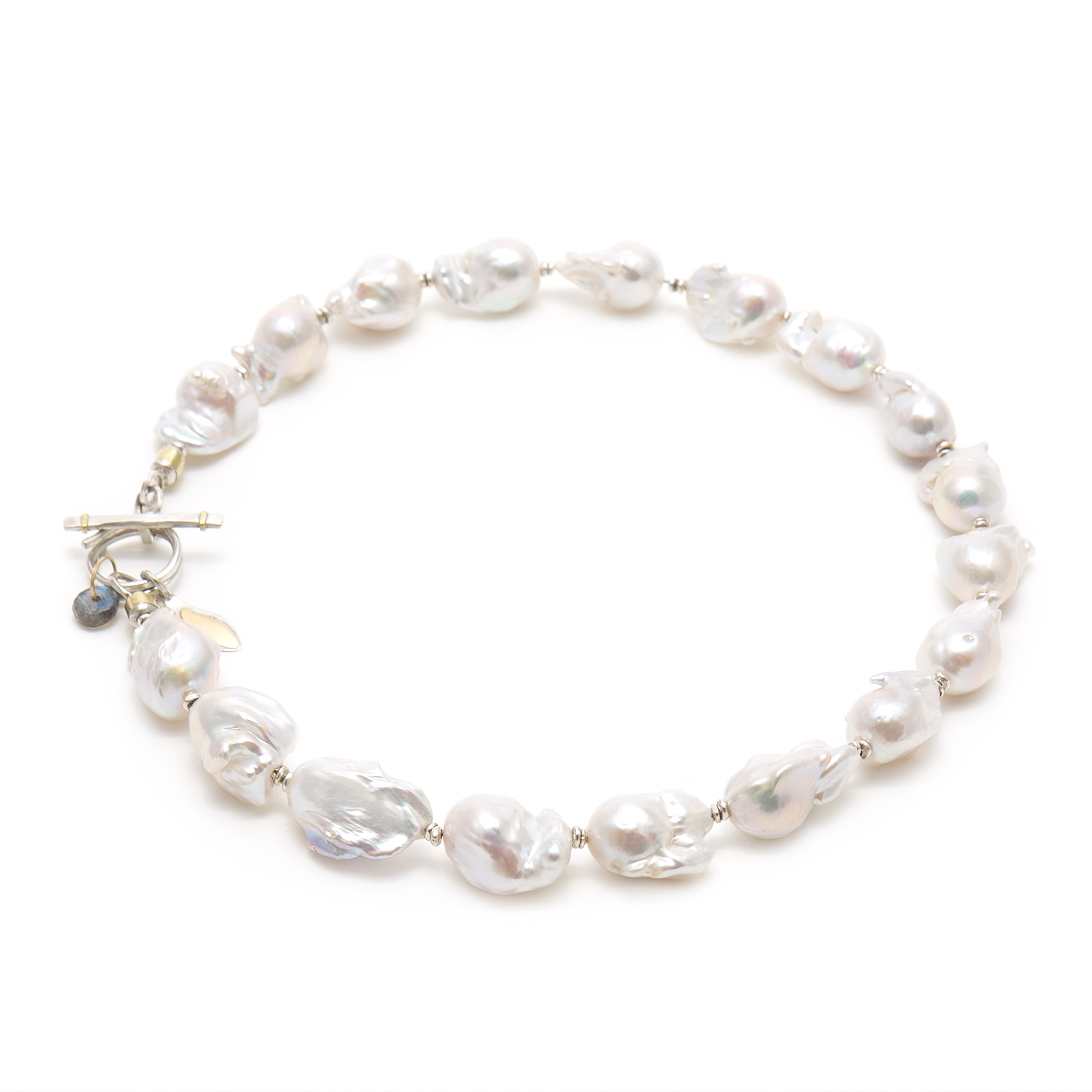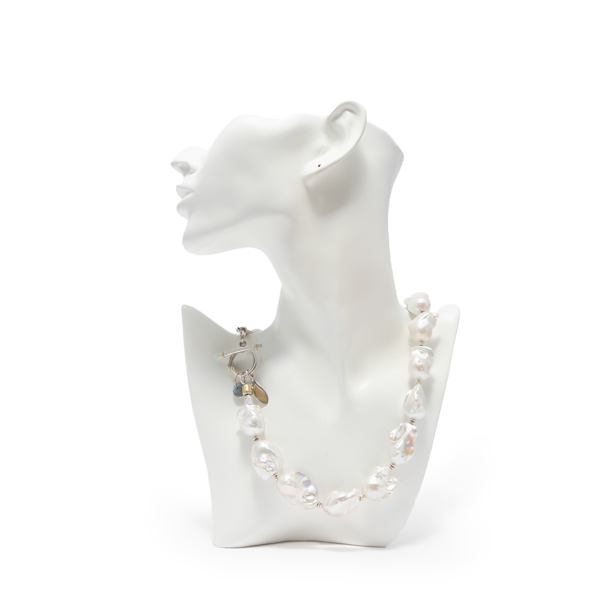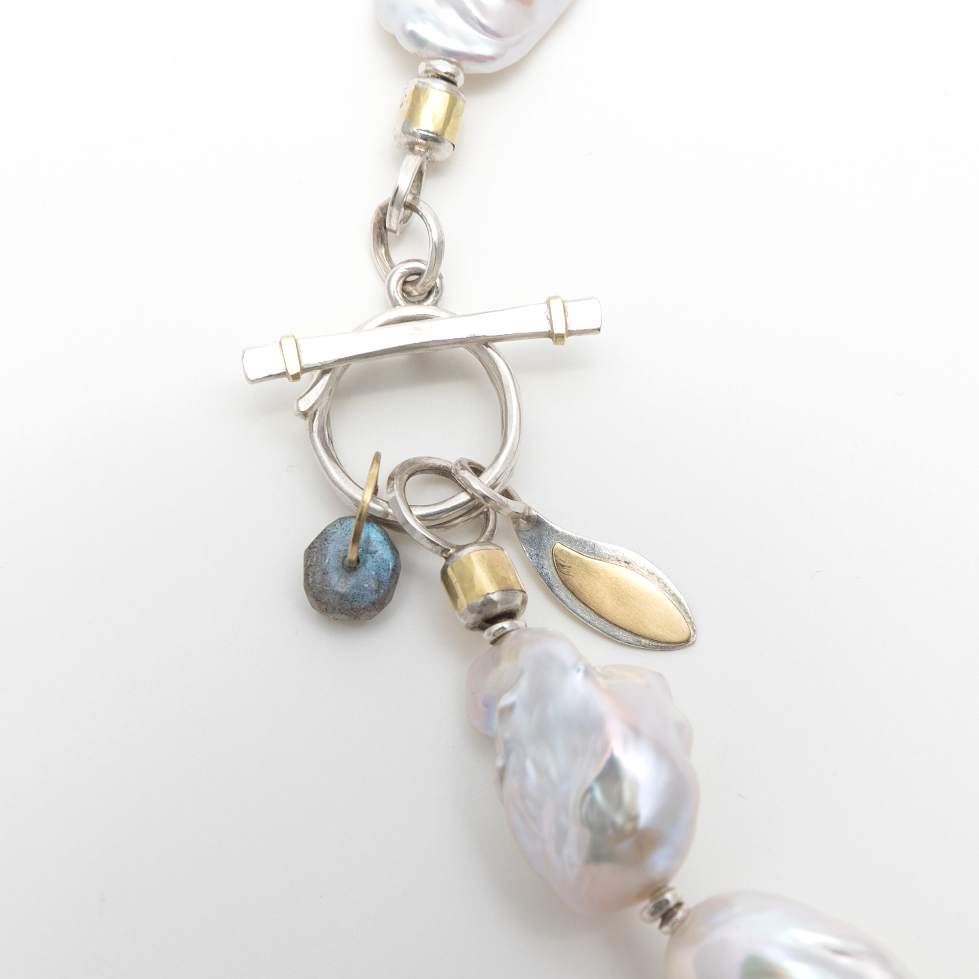 Diese satte, weiße Perlenkette besteht aus sehr großen, stark barocken Süßwasserperlen mit einer Größe bis zu 18 mm x 27 mm. Die Perlen haben einen tollen Glanz, Lüster genannt und außergewöhnliche Formen. Die handgearbeitete Knebelschließe aus Sterlingsilber, das partiell mit Gold belötet ist, wird seitlich getragen und ist ein weiteres schmückendes Highlight. Der Verschluss ist wie ein Spaltring spiralig gewickelt und zusätzlich mit zwei Einhängern bestückt, eine Blattform aus Silber und Gold, sowie einer schönen Steinperle aus Labradorith an einem feinen Goldring. Die Länge des Colliers beträgt ca. 54 cm.