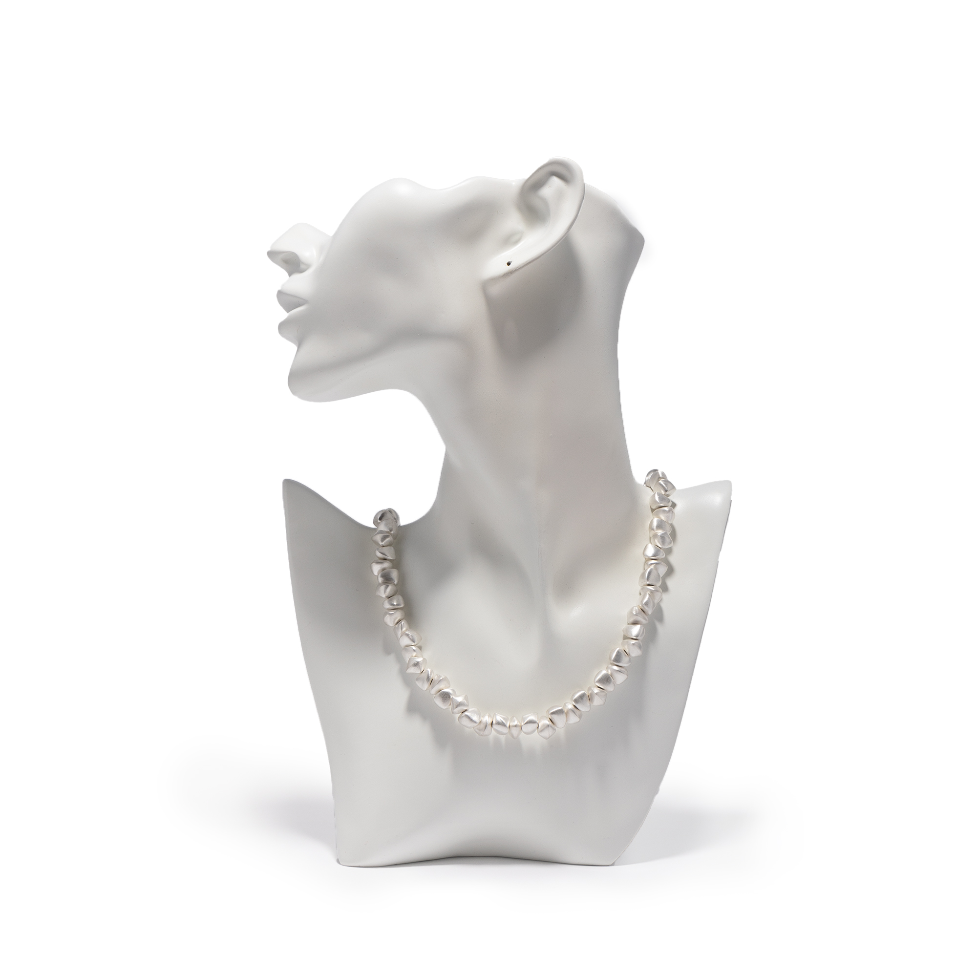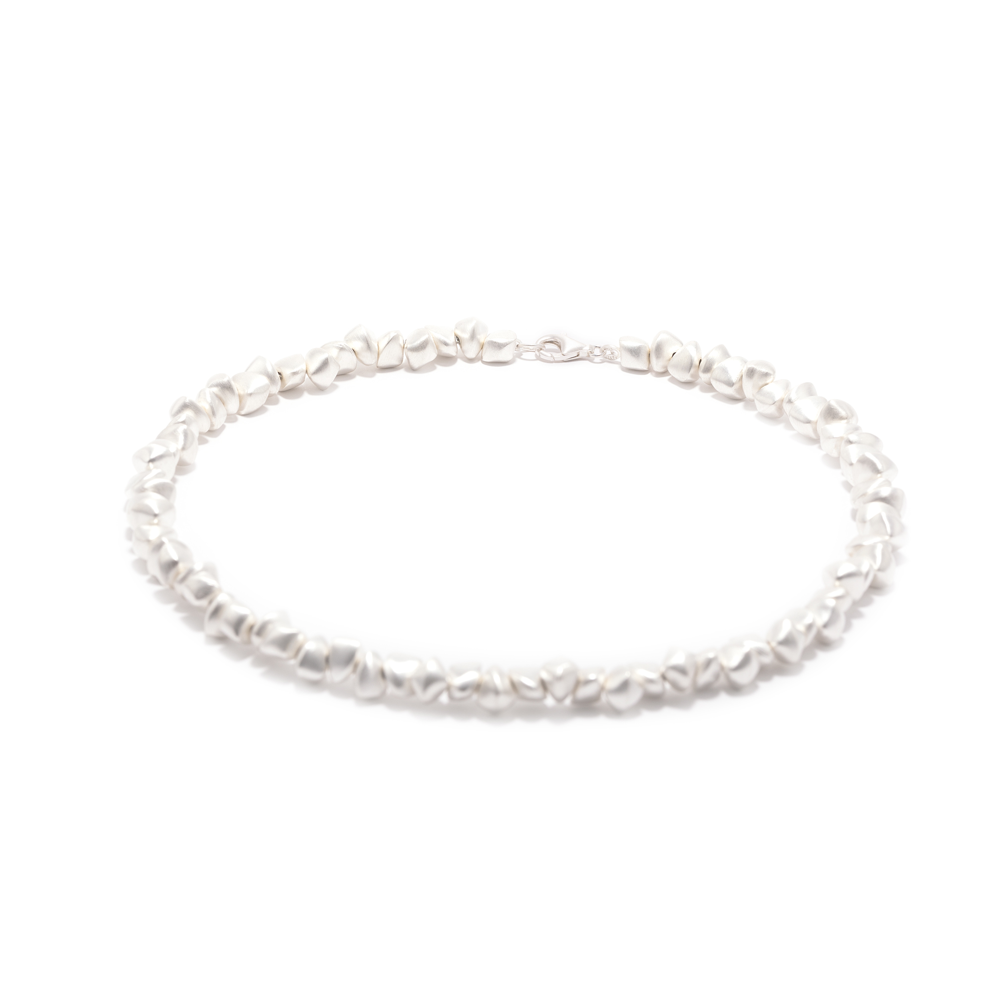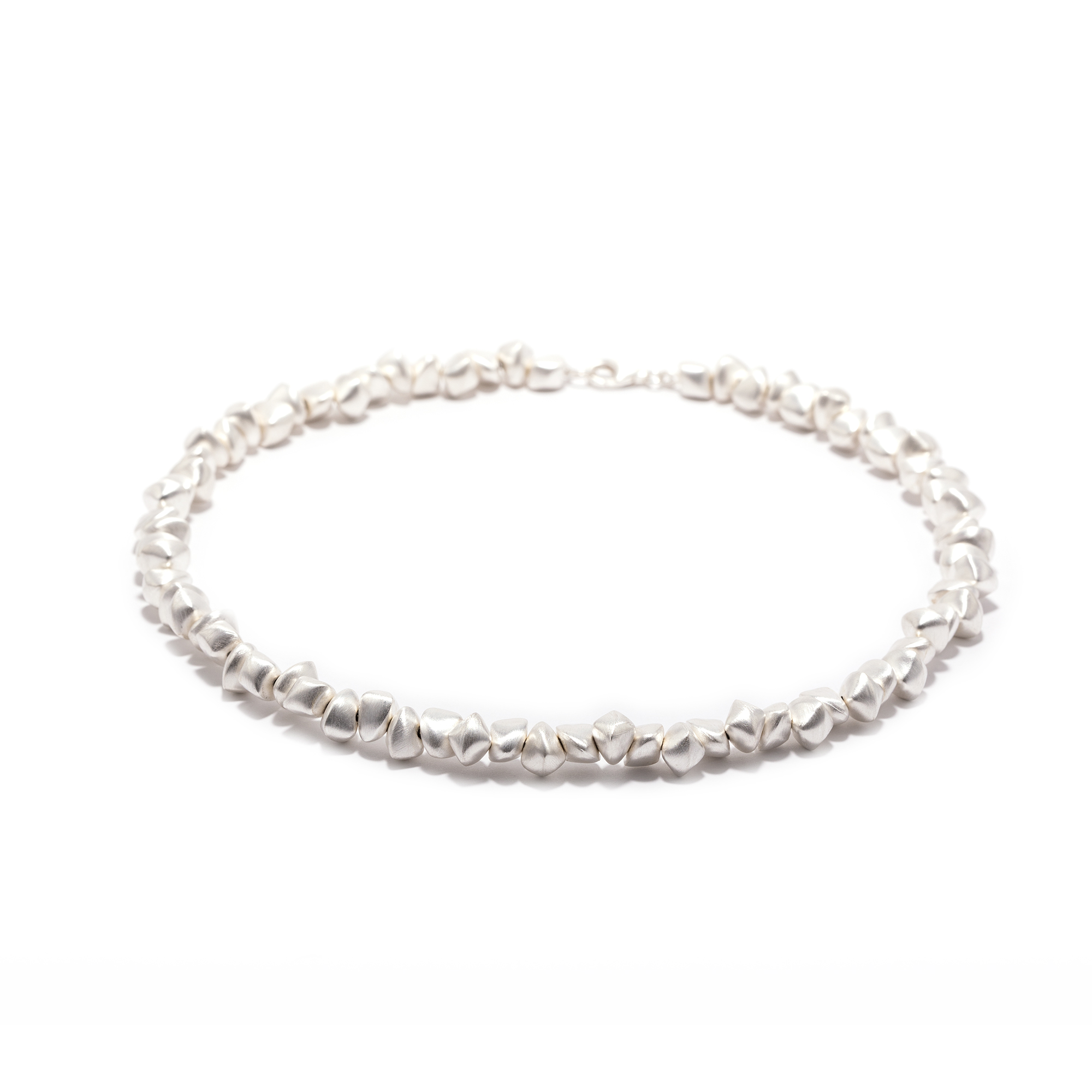 Dieses unkomplizierte Collier aus ist aus hellem Sterlingsilber gearbeitet und zeigt die ganze Schönheit dieses Edelmetalls. Die weich geformten und samtig mattierten Silberelemente sehen aus wie natürliche Kieselsteine und sind äußerst angenehm in der Haptik. Auf einem Edelstahlseil aufgereiht, ordnen sie sich unregelmäßig an. Die Kette ist ca 1o mm breit, etwa 48 Gramm schwer und hat eine Länge von ca. 45 cm.