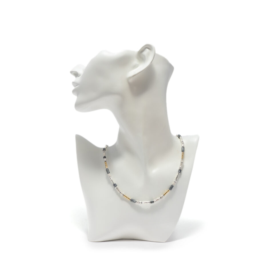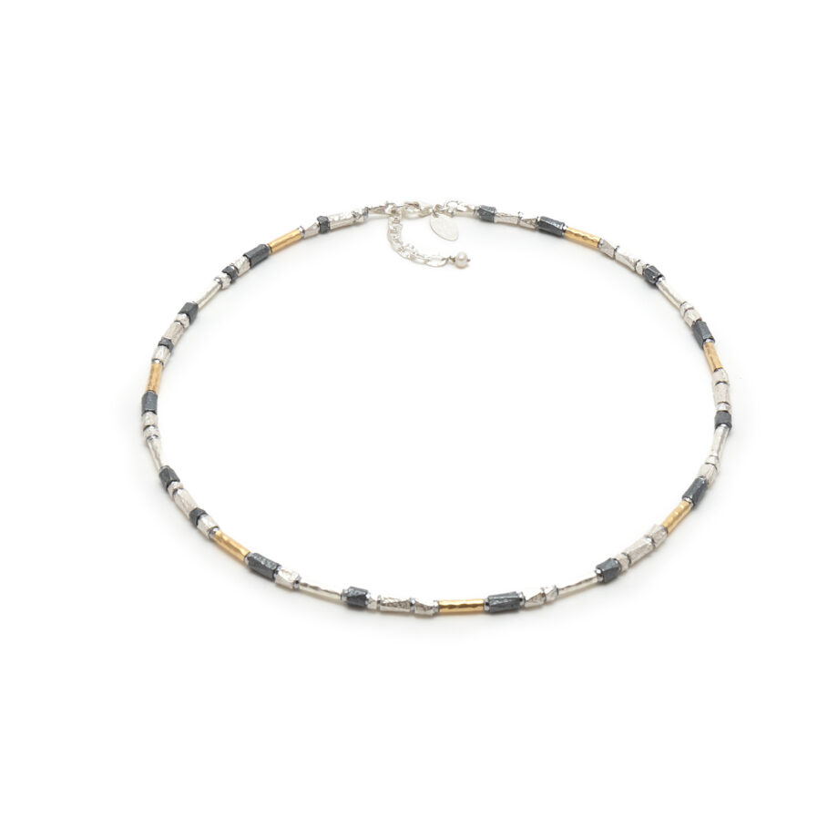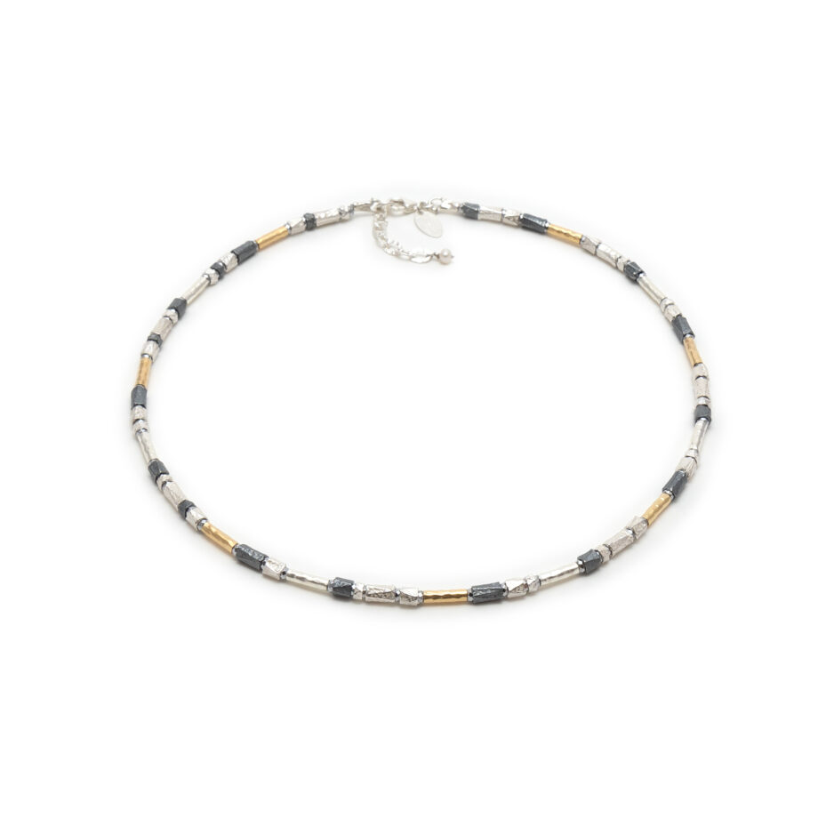 Dieses Collier aus Sterlingsilber besteht aus verschiedenen länglichen Elementen von ca. 4,5 mm Stärke, die unregelmäßig gearbeitet sind und so einen bewegten, handwerklichen Duktus zeigen. Sie sind zum Teil geschwärzt und vergoldet. Durch die Dreifarbigkeit lässt sich dieser Halsschmuck mit vielen Schmuckstücken kombinieren und ist ein idealer Begleiter für jede Garderobe und jede Gelegenheit. Das Collier hat eine Länge von ca. 45 cm und kann mit dem Verlängerungskettchen bis zu einer Länge von 48 cm erweitert werden.