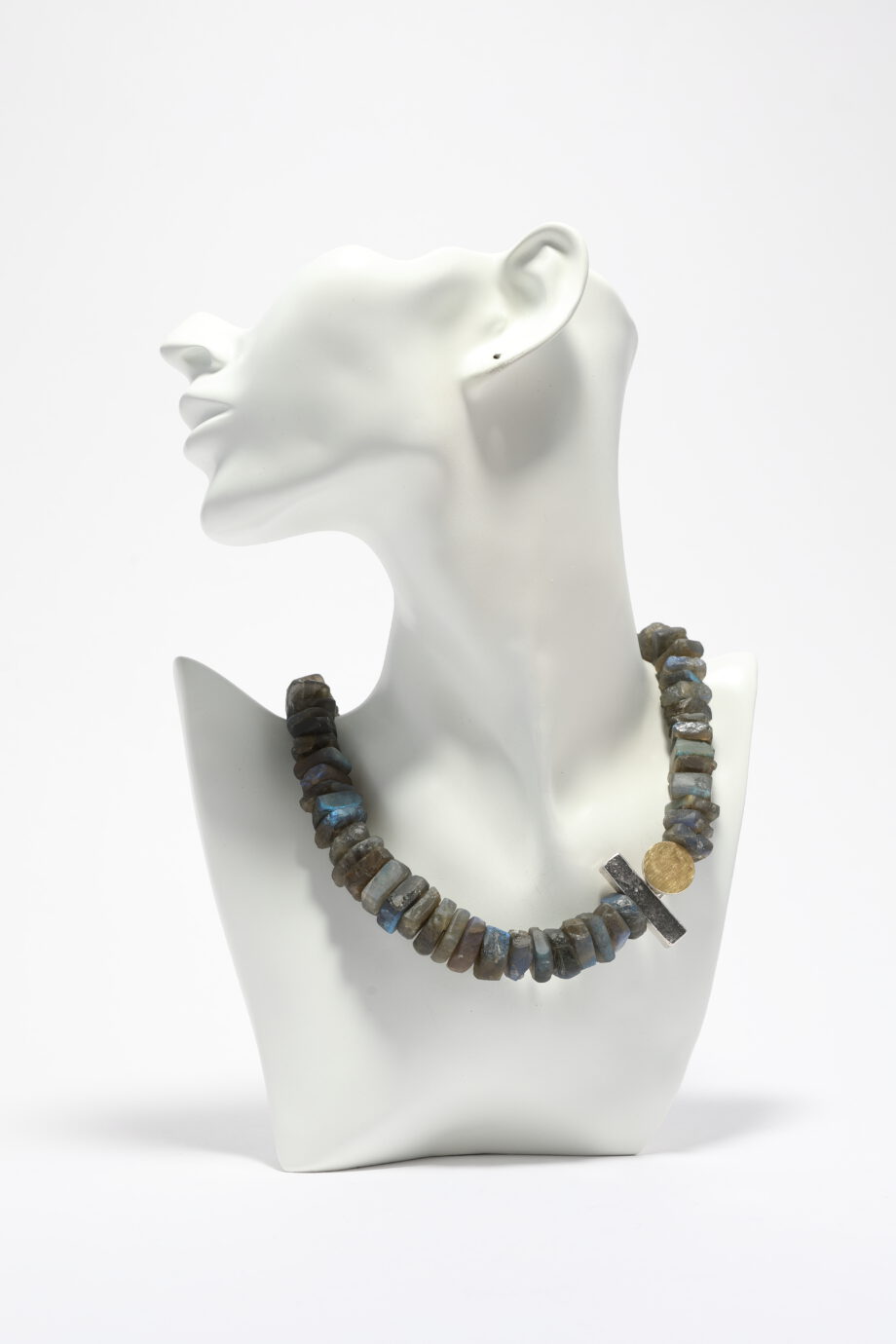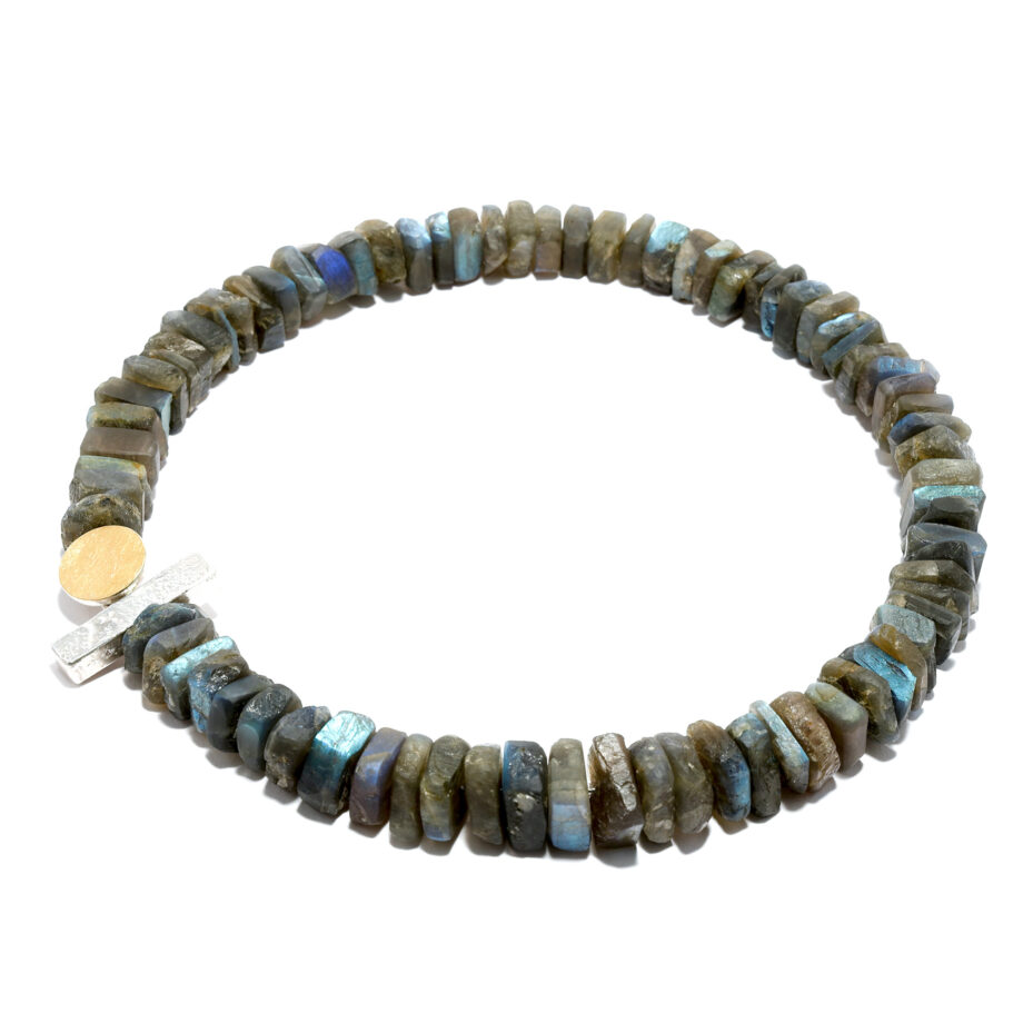 Dieses besondere Collier aus Labradorith zeigt das für diesen Edelstein typische, changierende Schillern in verschiedensten Blau- und Grüntönen. Dabei wurden die Steine in einer roh anmutenden, kristallinen Form belassenen und bestechen durch ihre Natürlichkeit und ihre samtige Haptik. Ein dazu passender Eyecatcher ist die individuell gestaltete Schmuckschließe, die seitlich getragen wird. Sie ist aus Sterlingsilber und zwei miteinander korrespondieren Elementen gearbeitet, die ebenso eine ursprüngliche Oberfläche mit einem handwerklichen Duktus aufweisen und partiell mit 750er Gelbgold belötet wurden. Der goldene Kreis ist ein spannender Kontrast zu den Blautönen in der Kette, und gleicht dem vollen Mond an einem nachtblauen Himmel. Dieses Collier ist das Richtige für eine Person die das Handwerkliche und Ursprüngliche liebt und das charakteristische, schillernde des Blau des Labradoriths zu schätzen weiß. Die Breite der Kette beträgt im Verlauf etwa 17 mm – 12 mm, die Länge ca. 47 cm und sie wiegt etwa 178 Gramm.