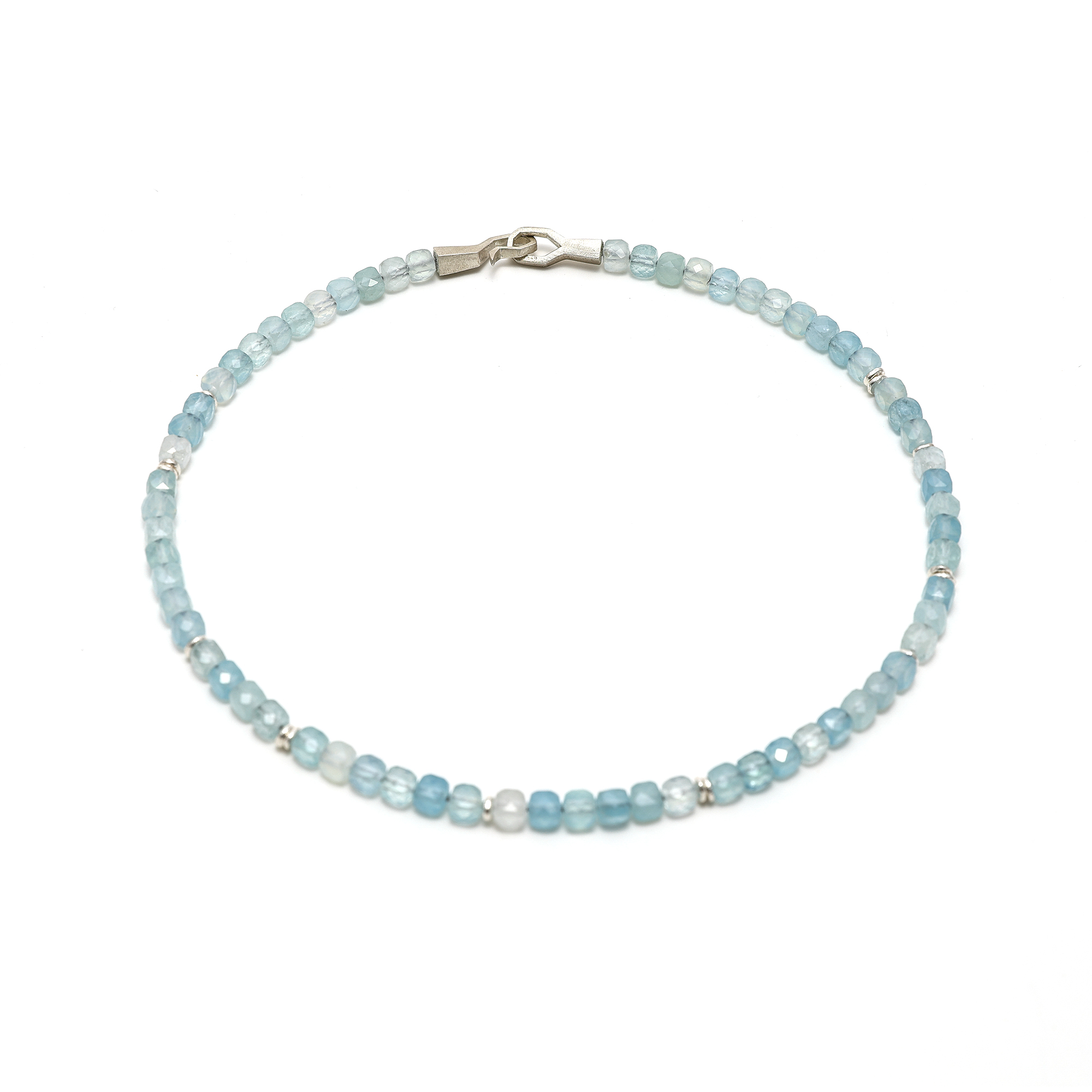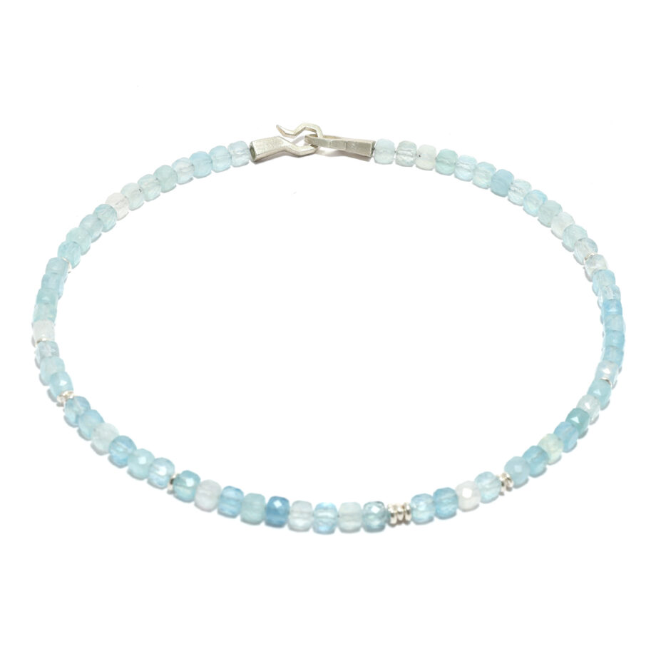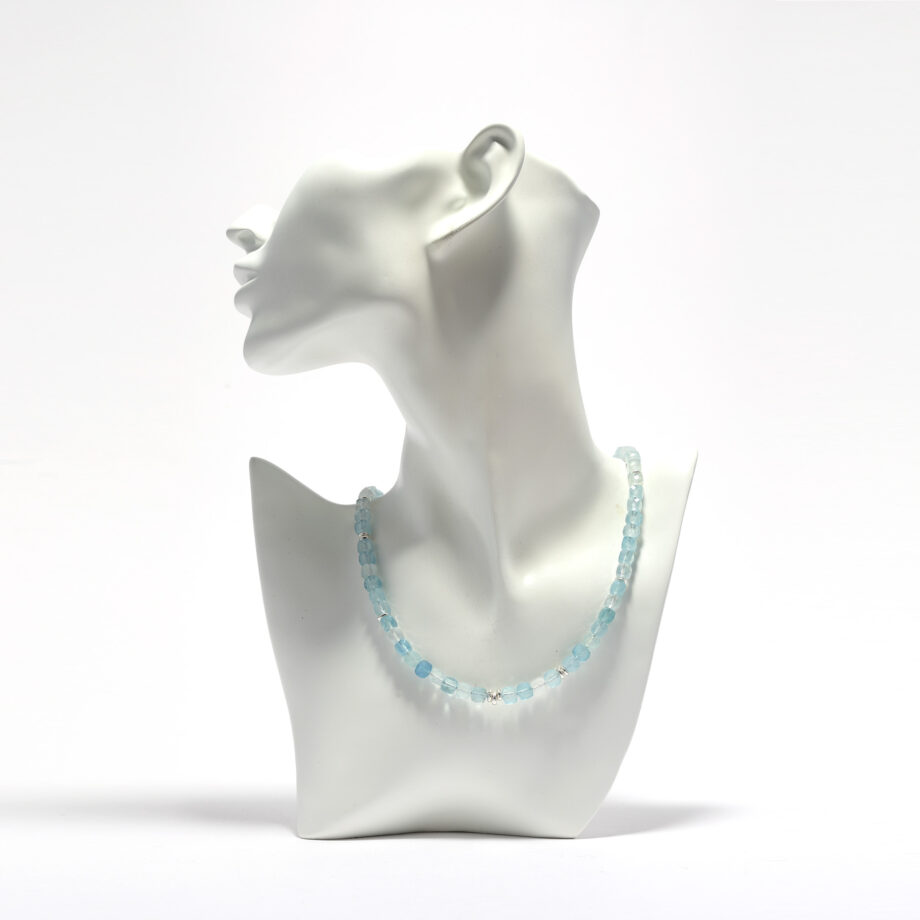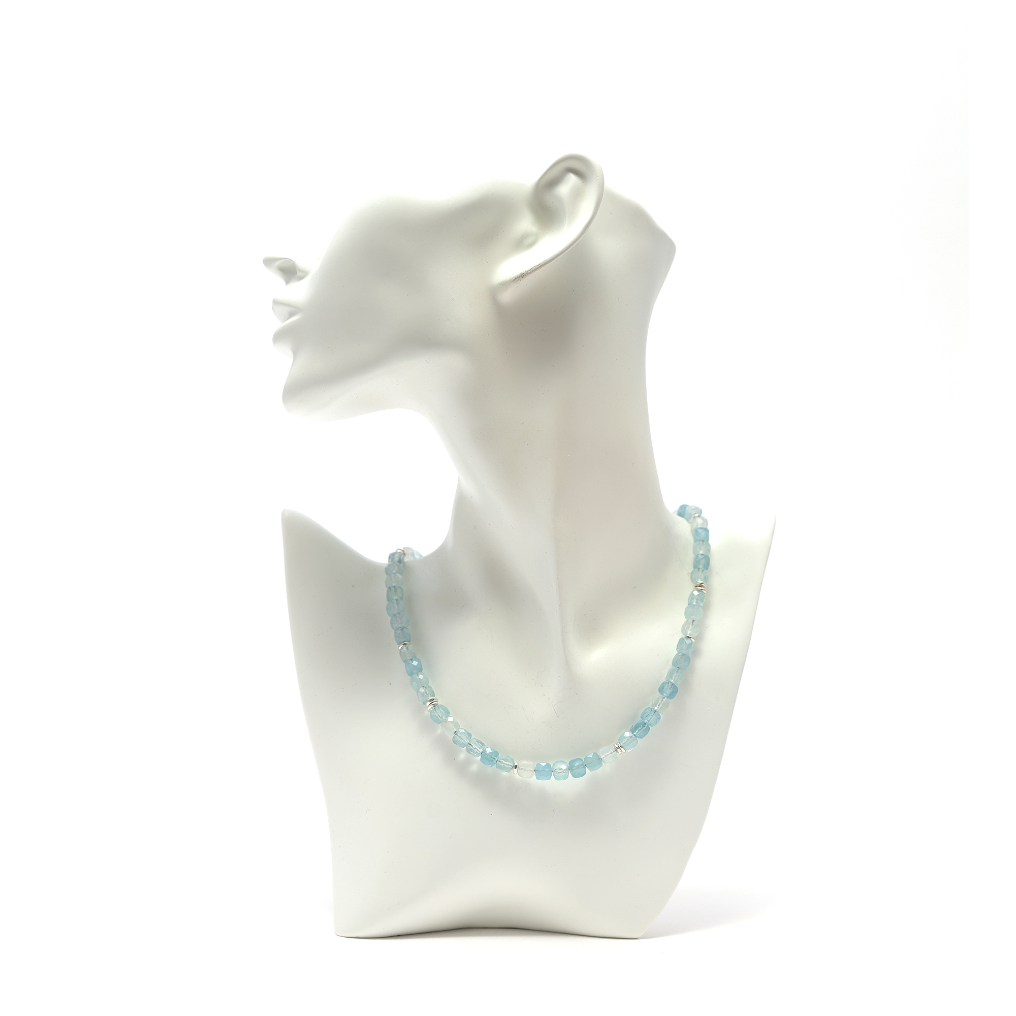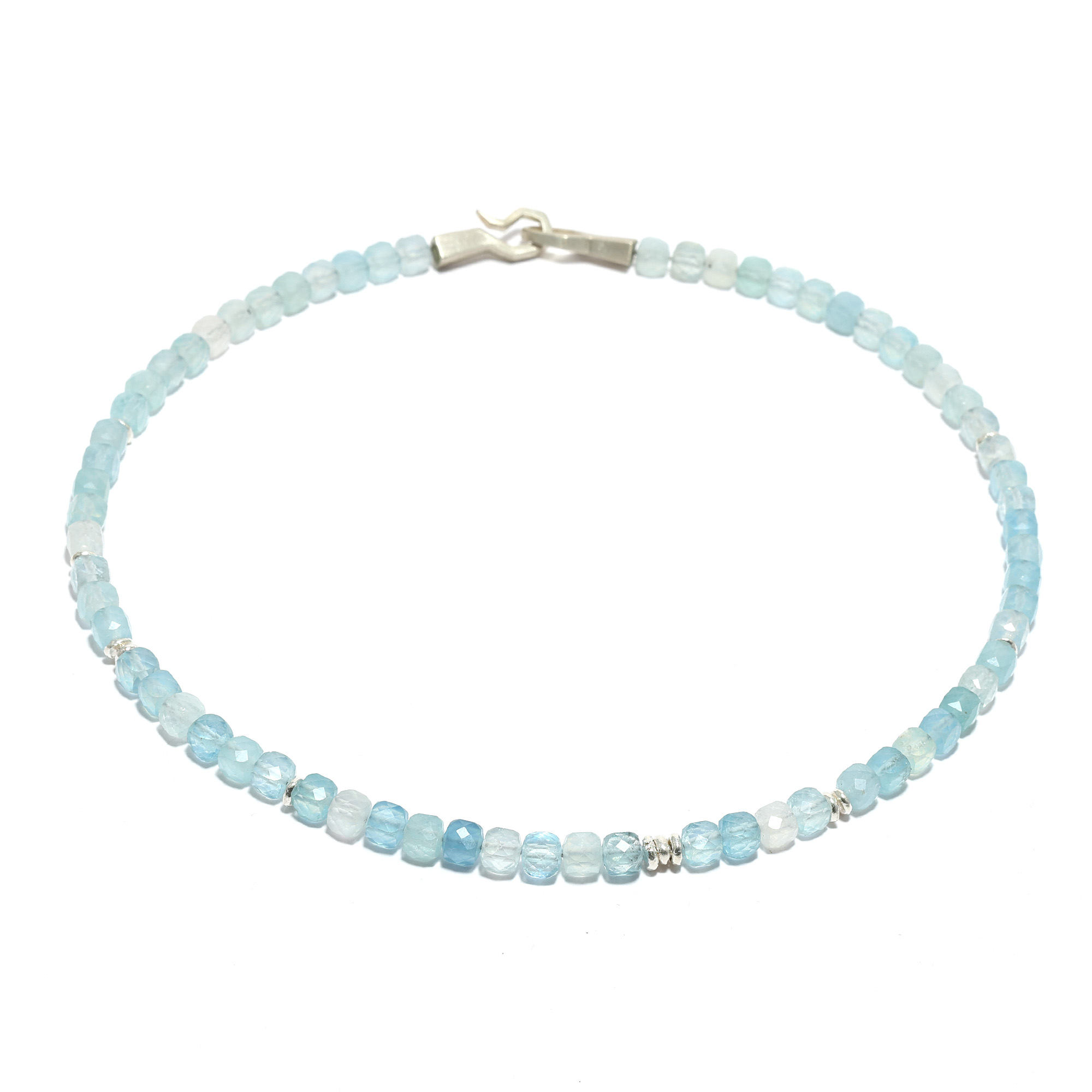 Dieses kühle Collier besteht aus facettierten Aquamarinwürfeln in verschiedenen Blautönen, die klassisch aufgereiht sind, aufgelockert durch kleine Silberelemente als Zwischenteile. Die Kette verfügt über eine schöne Hakenschließe aus Sterlingsilber. Die Edelsteinwürfel haben eine Kantenlänge von ca. 6 mm x 6 mm und die Gesamtlänge des Colliers beträgt etwa 45 cm.