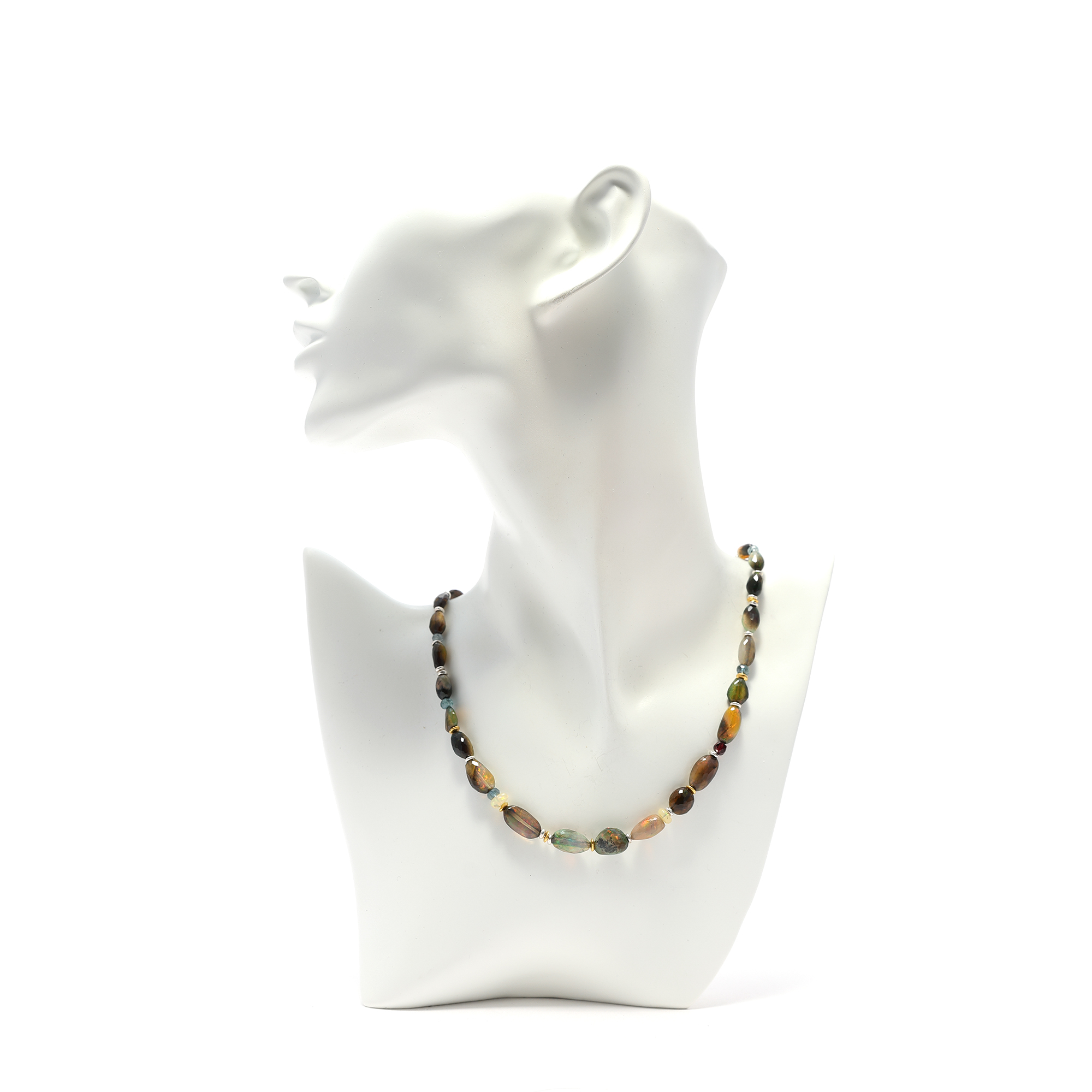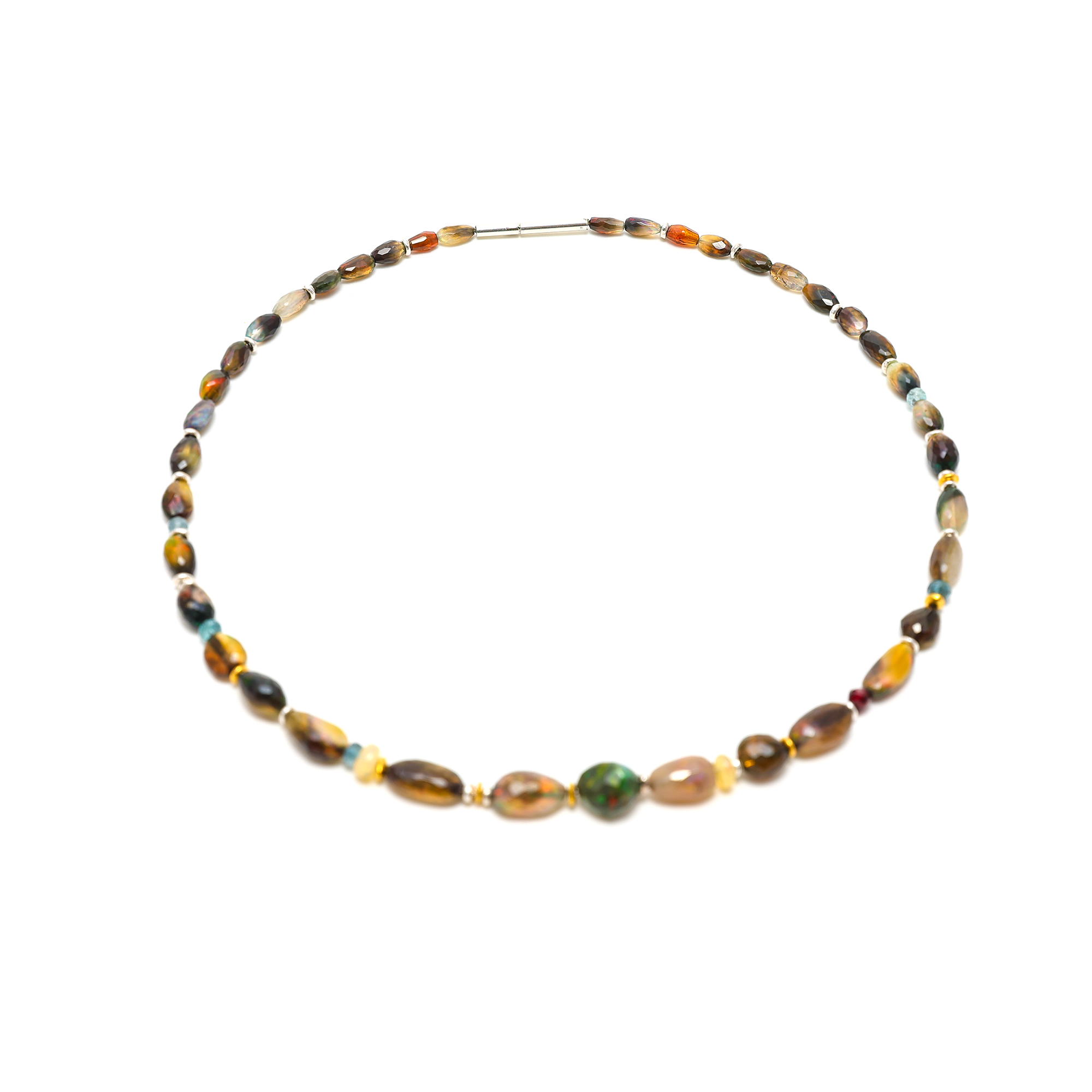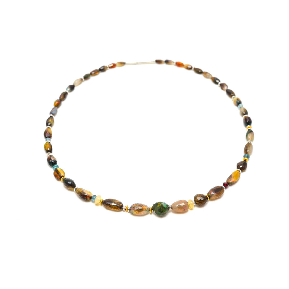 Dieses außergewöhnliche Collier hat eine sehr feine und klassische Anmutung. Es besteht aus facettierten, äthiopischen Opalen, die klassisch aufgereiht sind, aufgelockert durch kleine, unregelmäßige Nuggets aus Feingold und Sterlingsilber, Aquamarin und Granat. Was man zunächst an dieser Kette wahrnimmt, sind ihre warmen Armagnac – und Cognactöne. Das Farbenspiel der einzelnen Edelsteine entfaltet sich in Bewegung im Licht und zeigt dann das ganze für den Opal typische, schillernde Farbenspiel von intensiven Grün-, Blau- und Rottönen. Dabei ist jeder Stein anders und für sich gesehen ein unvergleichliches Unikat. Die Reihung hat einen Verlauf von in der Breite ca. 9 mm vorne zu 4 mm hinten. Insgesamt hat die Kette hat eine Länge von ca. 45 cm und verfügt über eine komfortabel zu handhabende und sichere Doppelclipschließe aus Sterlingsilber.