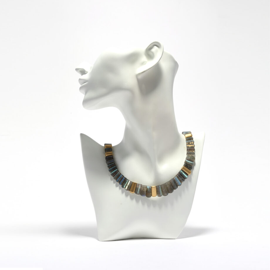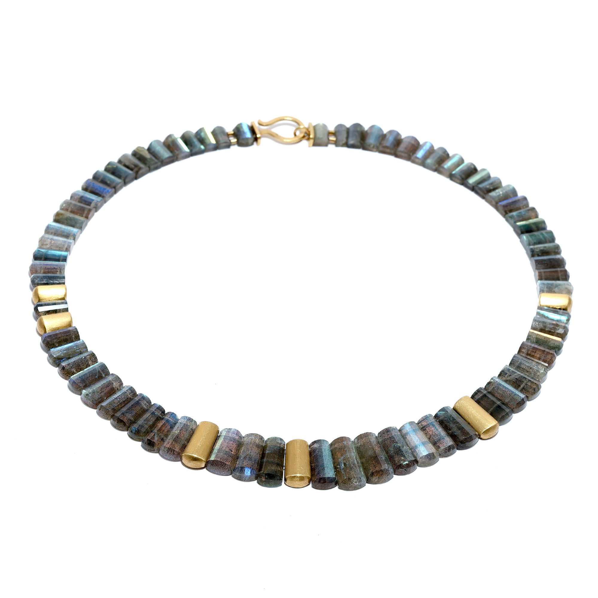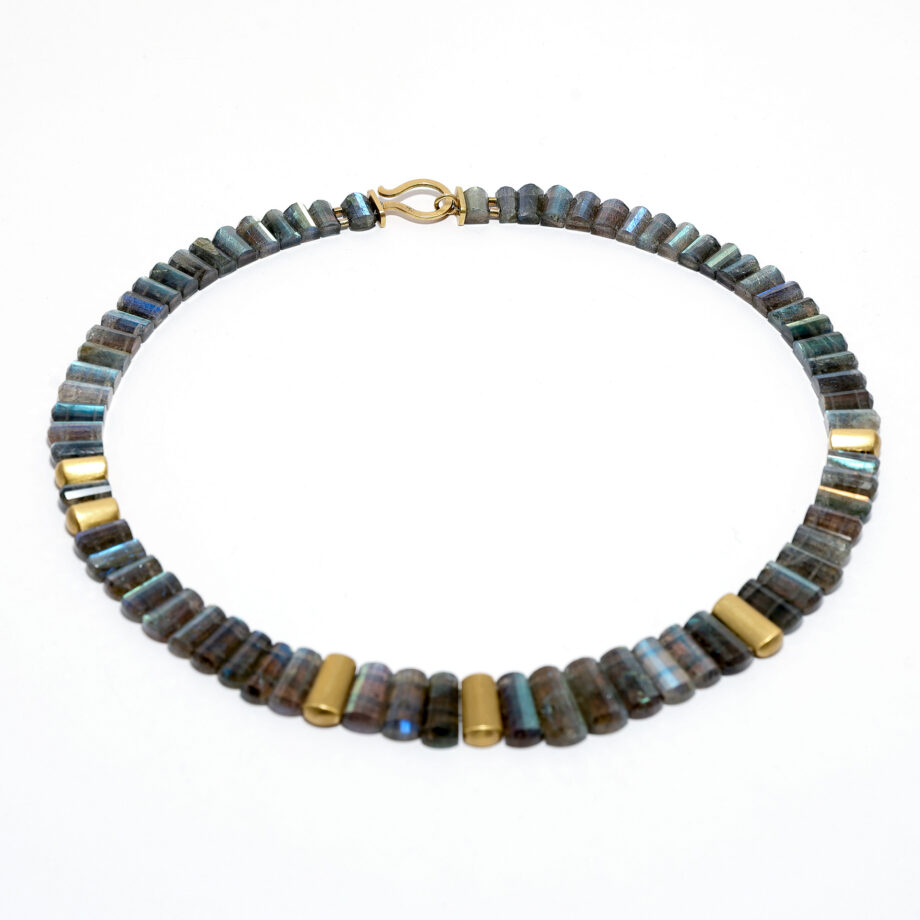 Dieses elegante Collier aus facettierten und doppelt gebohrten Labradorithstiften legt sich rund, wie ein feiner schmeichelnder Kragen um den Hals. Die sechs Zwischenteile und der schöne Hakenverschluss sind aus 750er Gold handgearbeitet. Die Kette hat einen Verlauf, ist vorne etwa 17 mm und hinten etwa 10 mm breit und entspricht einer Länge von etwa 48 cm. Es ist das richtige Schmuckstück für eine Person die eleganten und individuellen Halsschmuck liebt und die Gold und die vielfältigen und irisierenden Blau- und Grüntöne des Labradorith zu schätzen weiß.