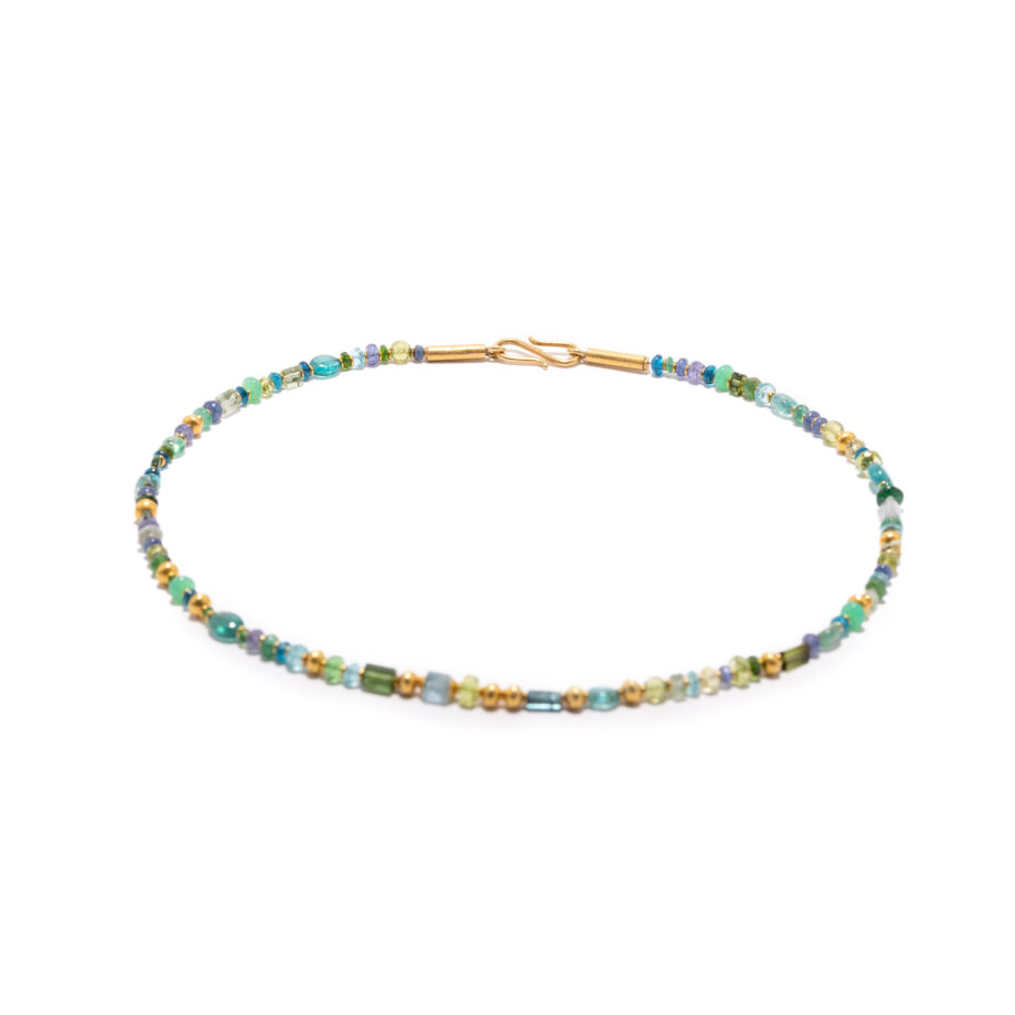 Dieses feine Collier besteht aus vielen verschiedenen Edelsteinen wie Turmalin, Aquamarin, Chrysopras, Tansanit, Apatit, Topas, Tsavorith und Peridot. Durch diese Zusammensetzung entsteht eine wundervolle Komposition aus natürlichen Blau -, Türkis- und Grünnuancen. Im Zusammenspiel mit den Zwischenteilen aus Feingold entsteht so ein Schmuckstück der Extraklasse. Die Breite der Kette beträgt etwa 5 mm, die Länge ca. 44 cm und sie wiegt etwa 21,5 Gramm. Als Verschluss dient ein klassischer S-Haken aus 750er Gold.