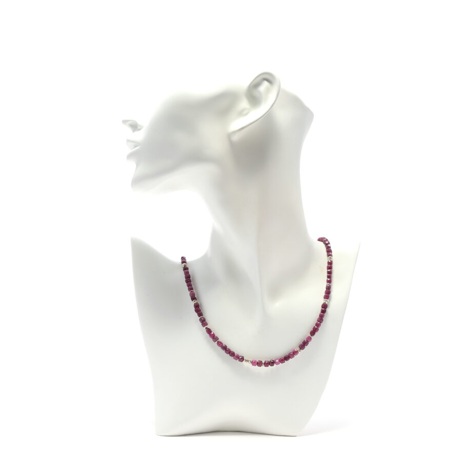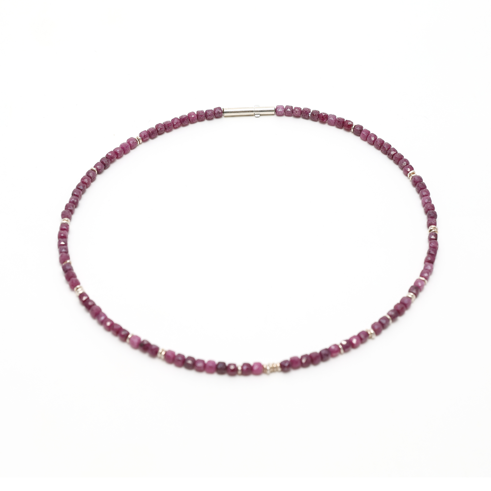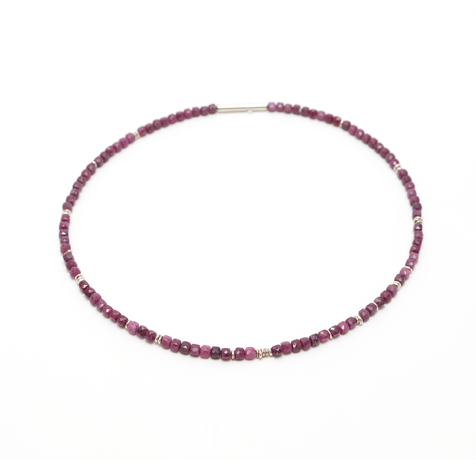 Dieses feine Collier besteht aus opaken, facettierten Rubinwürfeln, die klassisch aufgereiht sind, aufgelockert durch kleine, unregelmäßige Silbernuggets als Zwischenteile. Die Kette verfügt über eine komfortabel zu handhabende und sichere Doppelclipschließe aus Sterlingsilber. Die Edelsteinwürfel haben eine Kantenlänge von ca. 4 mm x 4 mm und die Gesamtlänge des Colliers beträgt etwa 45 cm.