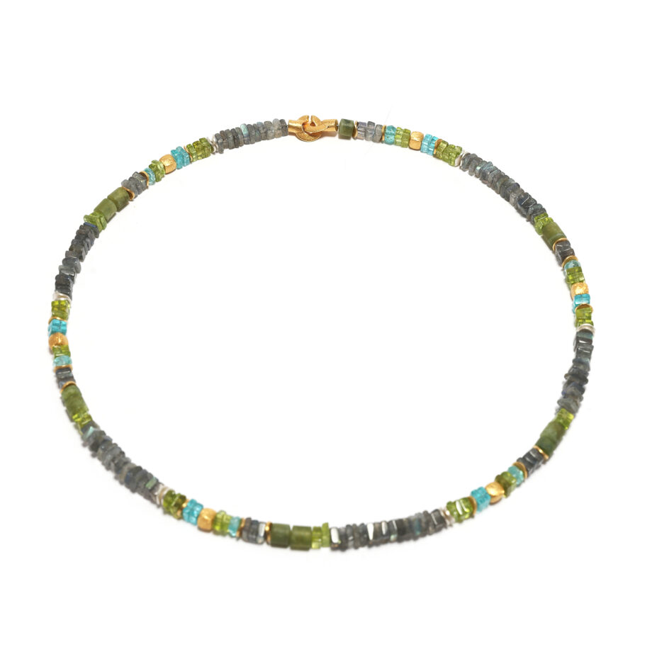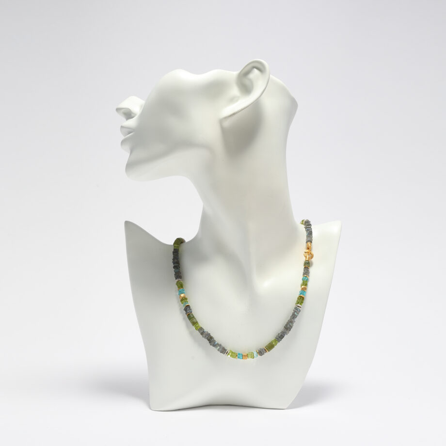 Bei diesem Collier aus den Edelsteinen Labradorith, Peridot und Apatit wurden die Edelsteine in Form von Rondellen facettiert, sowie in quadratischen Scheiben geschliffen. Das Ensemble wurde gekonnt mit Zwischenteilen aus unter anderem hochwertig vergoldetem Sterlingsilber kombiniert und mit einer attraktiven, vergoldeten Ringschließe versehen, die als zusätzlich schmückender Eyecatcher auch seitlich getragen werden kann. Die beiden Kreisringe der Schließe haben jeweils einen Schlitz über den sie zusammengesteckt werden und das Collier sicher verschließen. Es ist das richtige Schmuckstück für eine Person, die die vielfältigen und irisierenden Blau- und Grüntöne dieser Edelsteine liebt. Durch die Zweifarbigkeit des Edelmetalls ist dieses Collier sehr kombinationsfreudig und alltagstauglich Die Breite der Kette beträgt etwa 5 mm und die Länge ca. 45 cm.