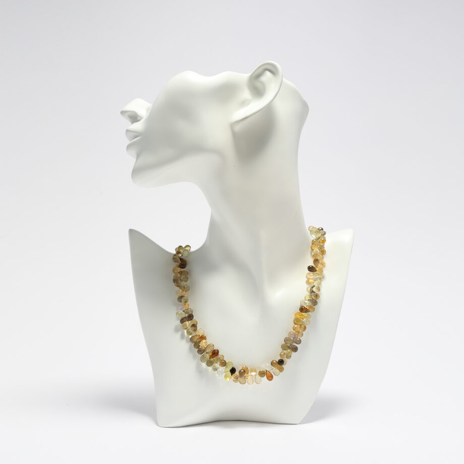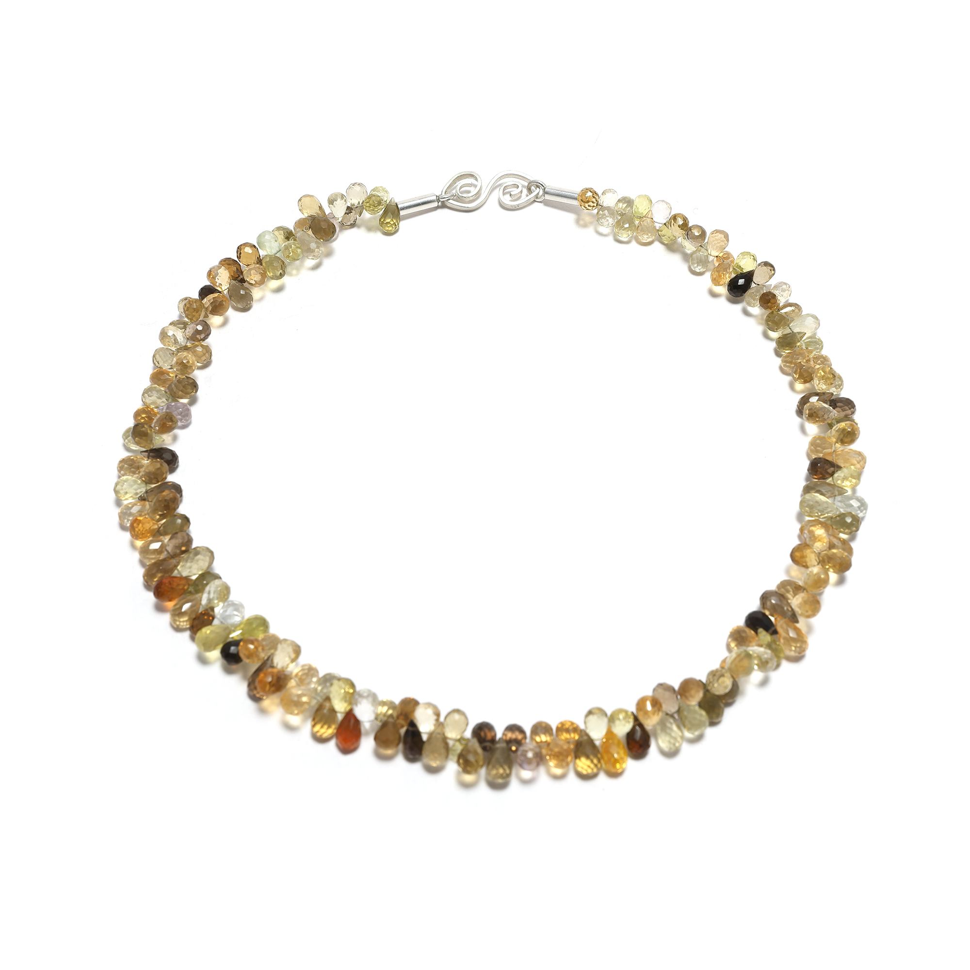 Dieses außergewöhnlich schöne Collier hat eine edle und sehr lebendige Ausstrahlung. Es besteht aus verschiedenen naturfarbenen Quarzen, wie Citrinen, Bergkristallen und Rauchquarzen, die zu feinen, facettierten Tropfen von ca. 5 mm x 9 mm geschliffen wurden. Sie entfalten ein bezauberndes Spiel aus warmen Honigfarben und schillernden Goldtönen. Das Spektrum der unterschiedlichen Edelsteine entfaltet sich in Bewegung im Licht und ist von faszinierender Schönheit. Dabei ist jeder Stein ein wenig anders und für sich gesehen ein kleines Unikat. Die Kette hat eine Breite ca. 13 mm, eine Länge von ca. 45 cm und verfügt über eine handgearbeitete, formschöne Hakenschließe aus Sterlingsilber, die als zusätzlicher Eyecatcher auch seitlich sichtbar getragen werden kann.
