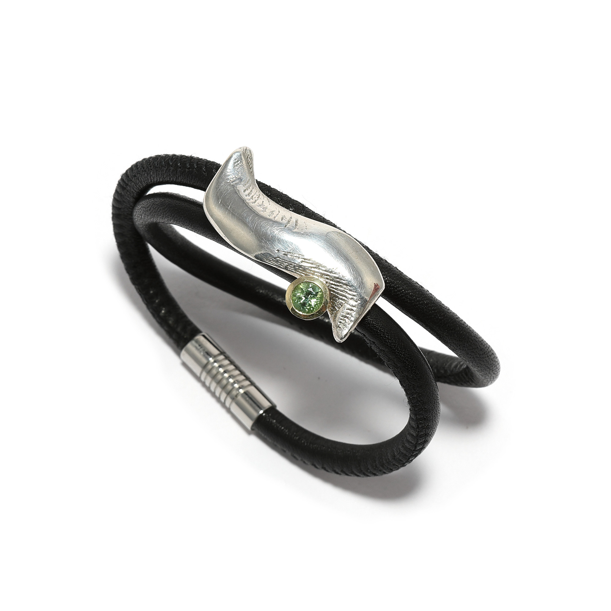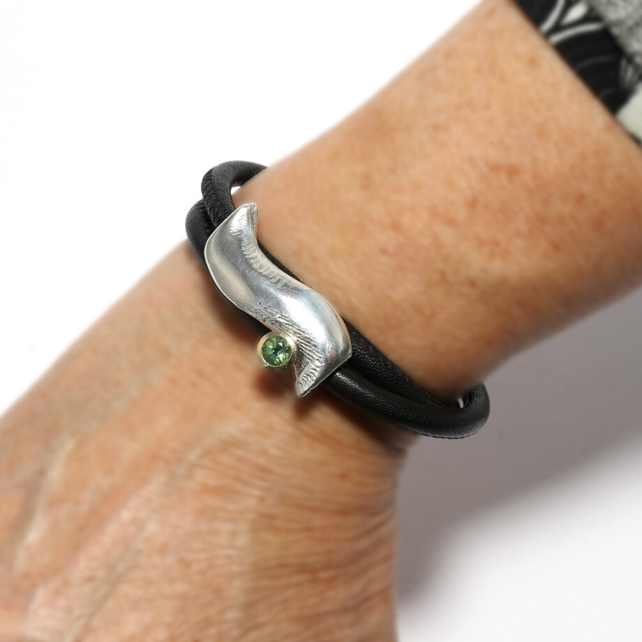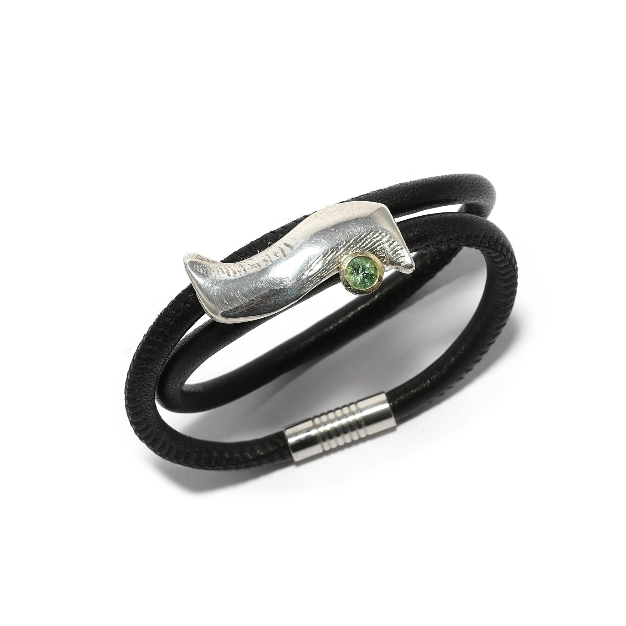 Ein Armband aus weichem Nappaleder, mit einem Mittelteil aus Sterlingsilber, das mit einem in Gold gefassten, grünen Turmalin versehen ist.