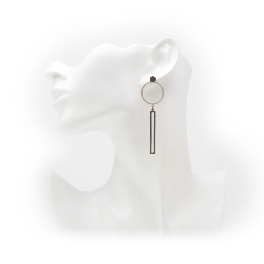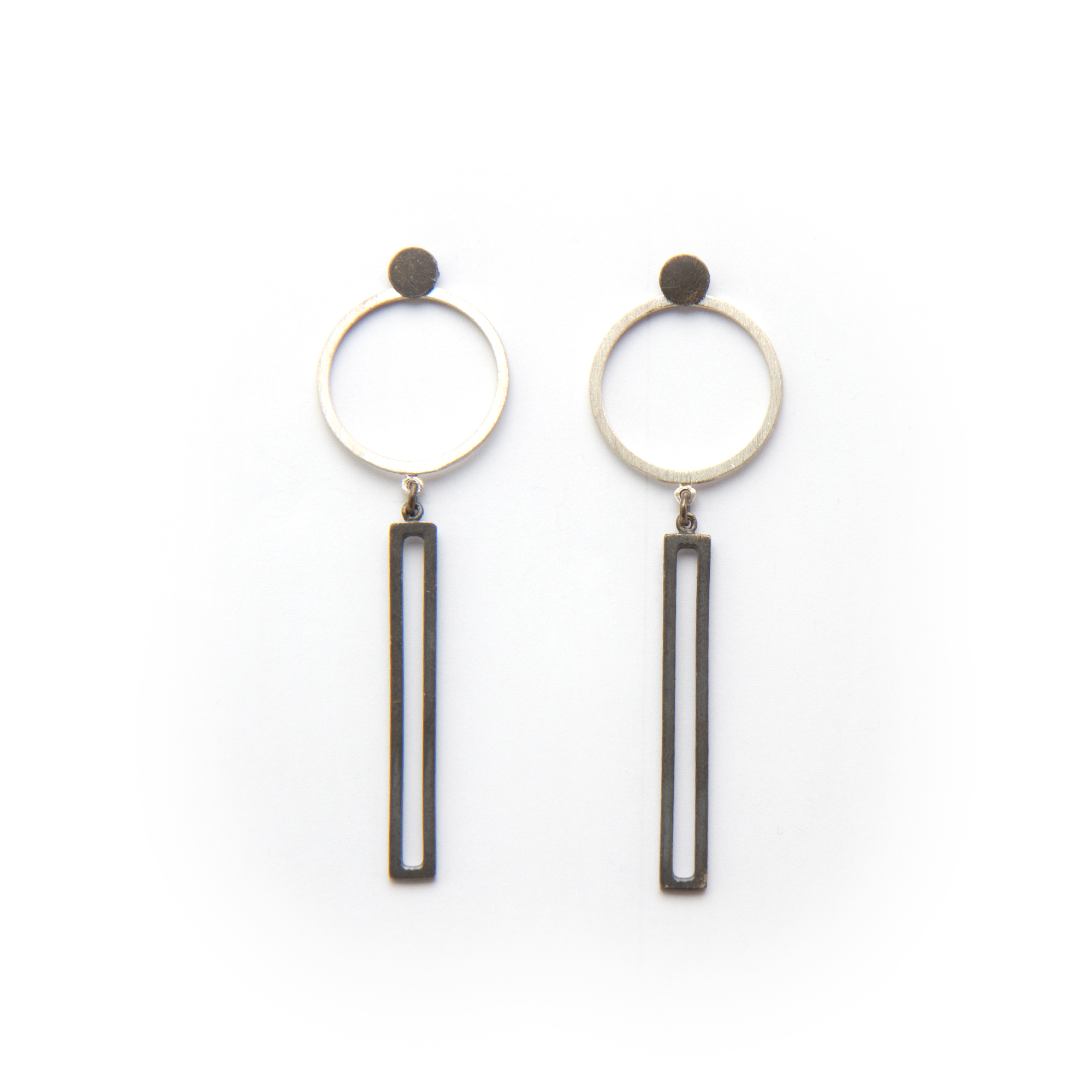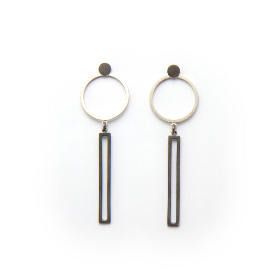 Große und dennoch leichte Ohrstecker in einem graphischen Design. Das Silber wurde partiell sulfidiert, wodurch die charakteristische Schwärzung auf den unter den Kreisen beweglich angebrachten, schlanken Rechtecken entsteht. Die hellen Kreise haben ein Außendurchmesser von ca. 21,5 mm und der Ohrschmuck hat insgesamt eine Höhe von ca. 70 mm. Ein einzelner Ohrring wiegt etwa 3,4 Gramm.