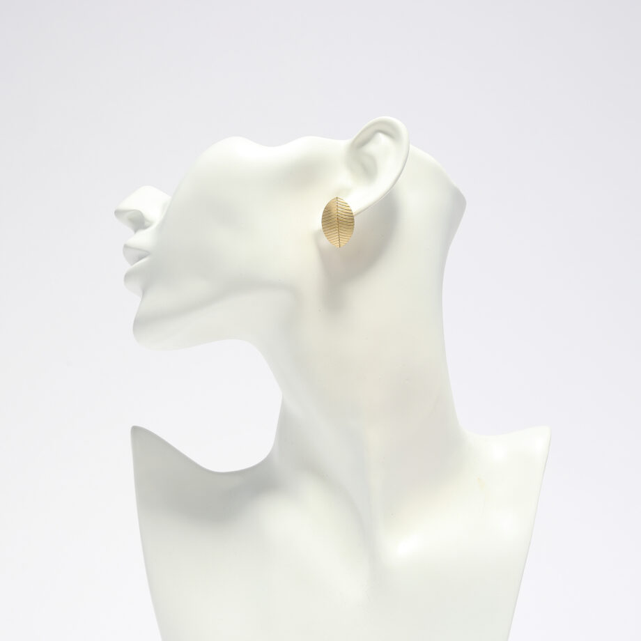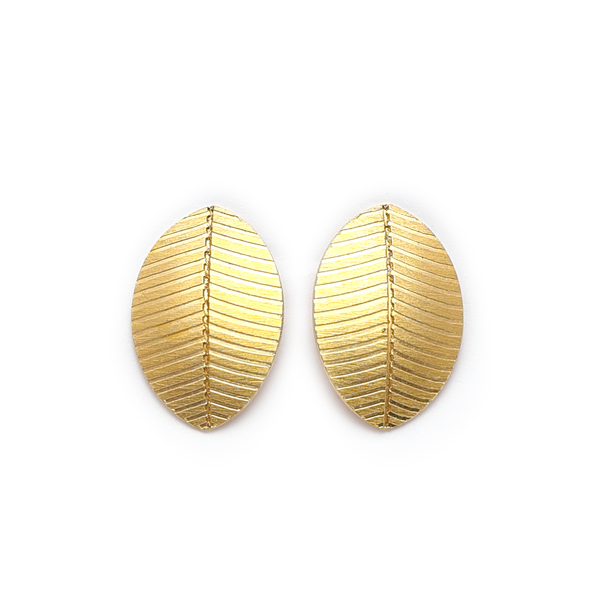Blattförmige Ohrstecker aus leicht konvex geformtem, vergoldetem Sterlingsilber. Die Ohrstecker messen ca. 20 mm x 13 mm, sind etwa 0,5 mm stark. Sie wiegen etwa ein Gramm je Ohrstecker und sind damit angenehm leicht.