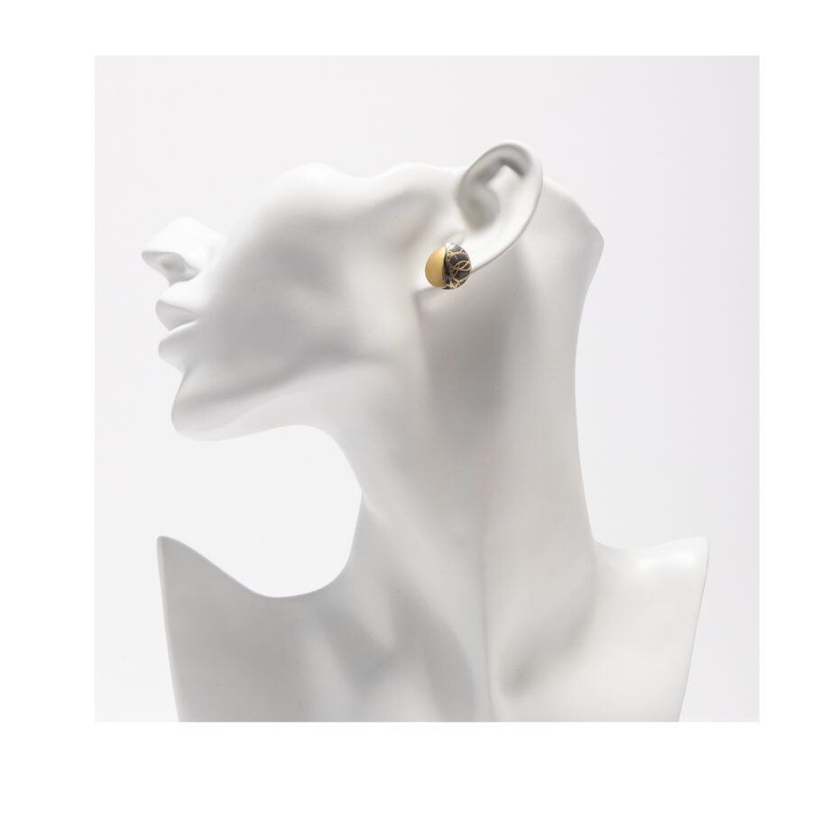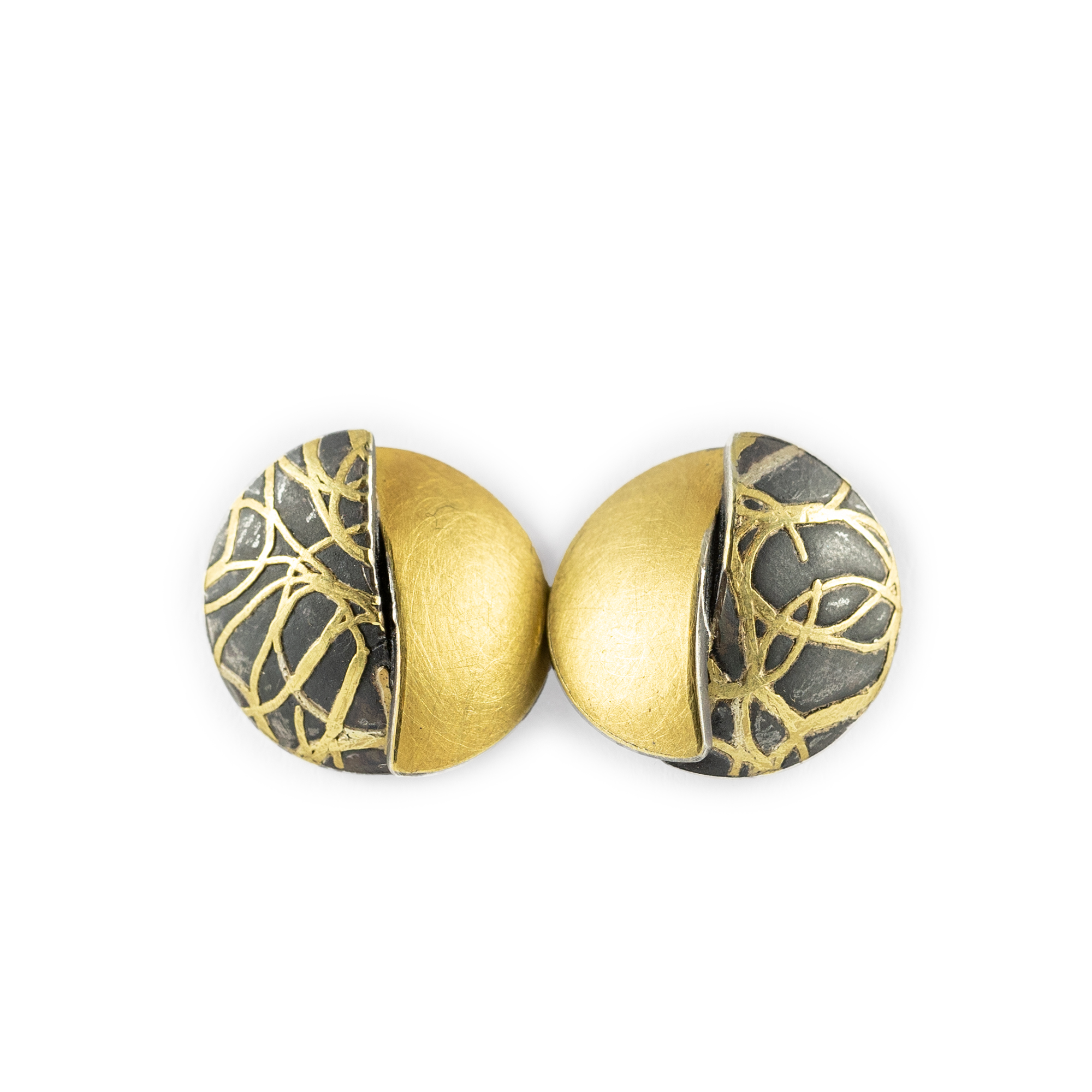Diese Ohrstecker sind aus geschwärztem Sterlingsilber in Kombination mit 750er Gold gearbeitet. Die kreisförmige Grundform wurde konvex gewölbt und mittig geteilt. Auf die eine Hälfte wurde flächig Gold aufgebracht, auf die andere ebenso, jedoch in Form von Goldfäden als Ornament. Anschließend wurden die beiden Hälften plastisch versetzt wieder zusammengefügt. Die Ohrstifte auf der Rückseite, sowie die Muttern sind ebenfalls aus 750er Gold. Die Ohrstecker haben einen Durchmesser von etwa 14 mm.