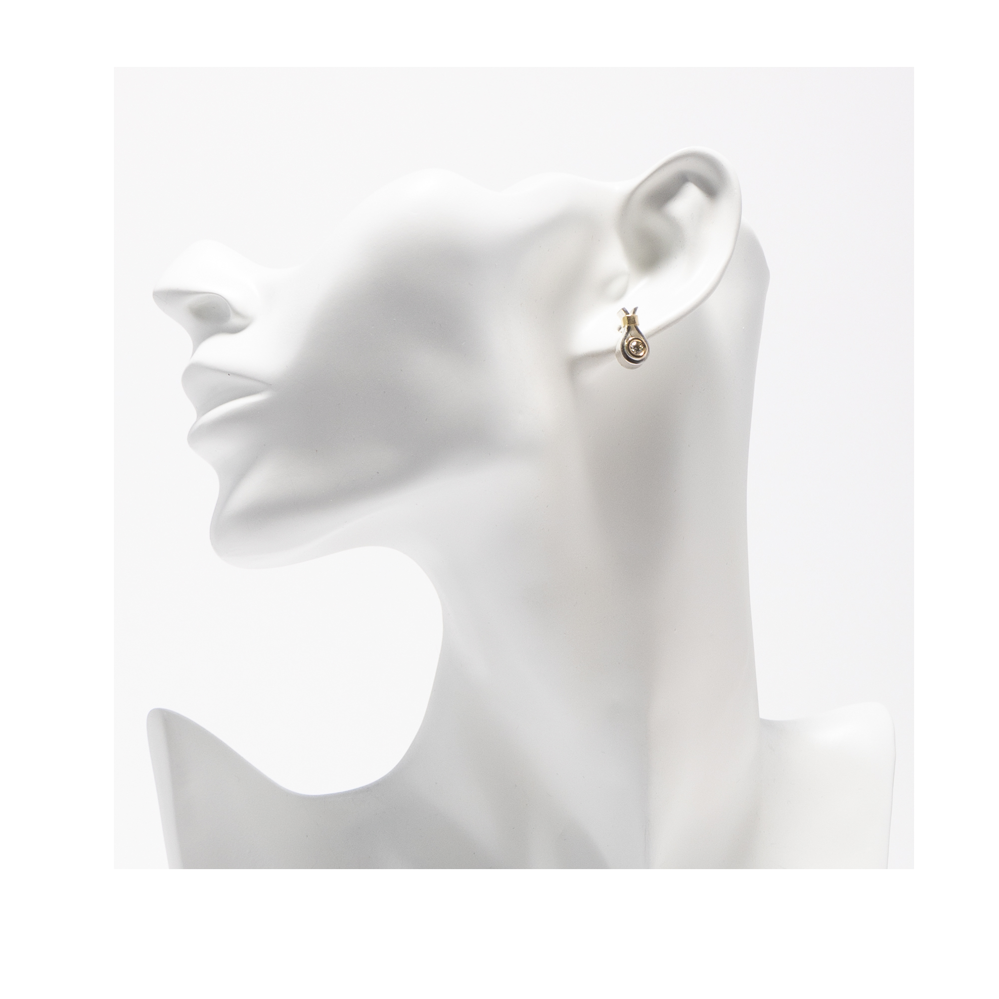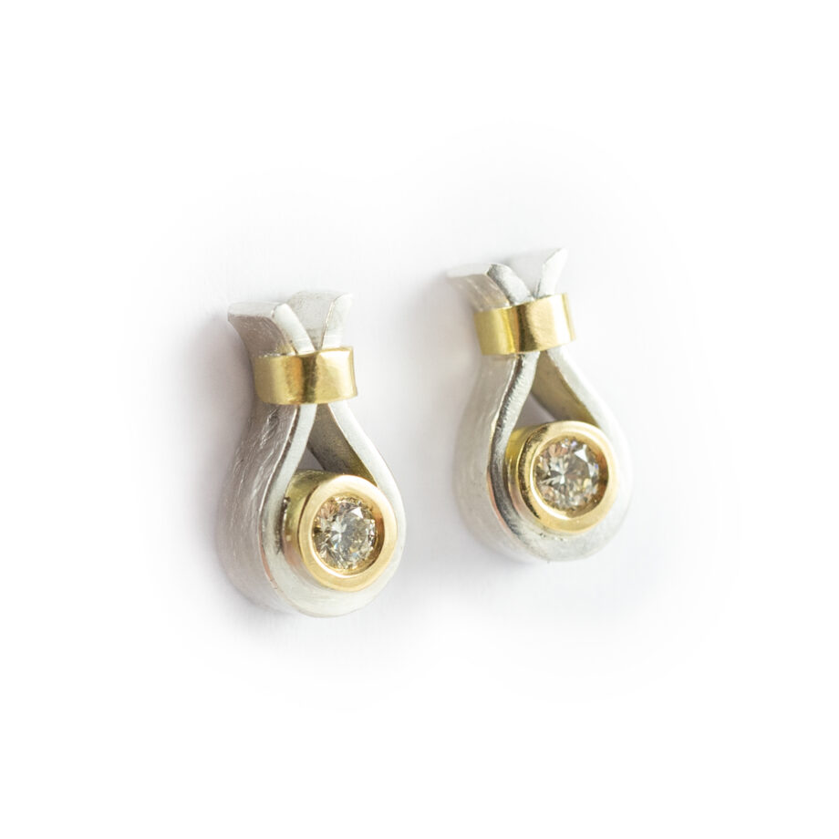 Feine Ohrstecker aus strukturiertem Sterlingsilber, gearbeitet wie zwei Schlaufen, die jeweils einen in 750er Gold gefassten, naturfarben getönten Brillanten umfassen. Oben werden die Schlaufen mit je einer kleinen Goldklammer optisch gehalten. Die Brillanten sind champagner-grau getönt, si – p1 und wiegen zusammen 0,20 ct. Die Ohrstifte sind aus Sterlingsilber und befinden sich auf der Rückseite in Höhe der Goldklammern.