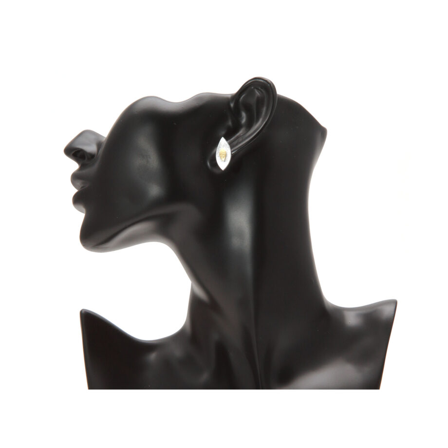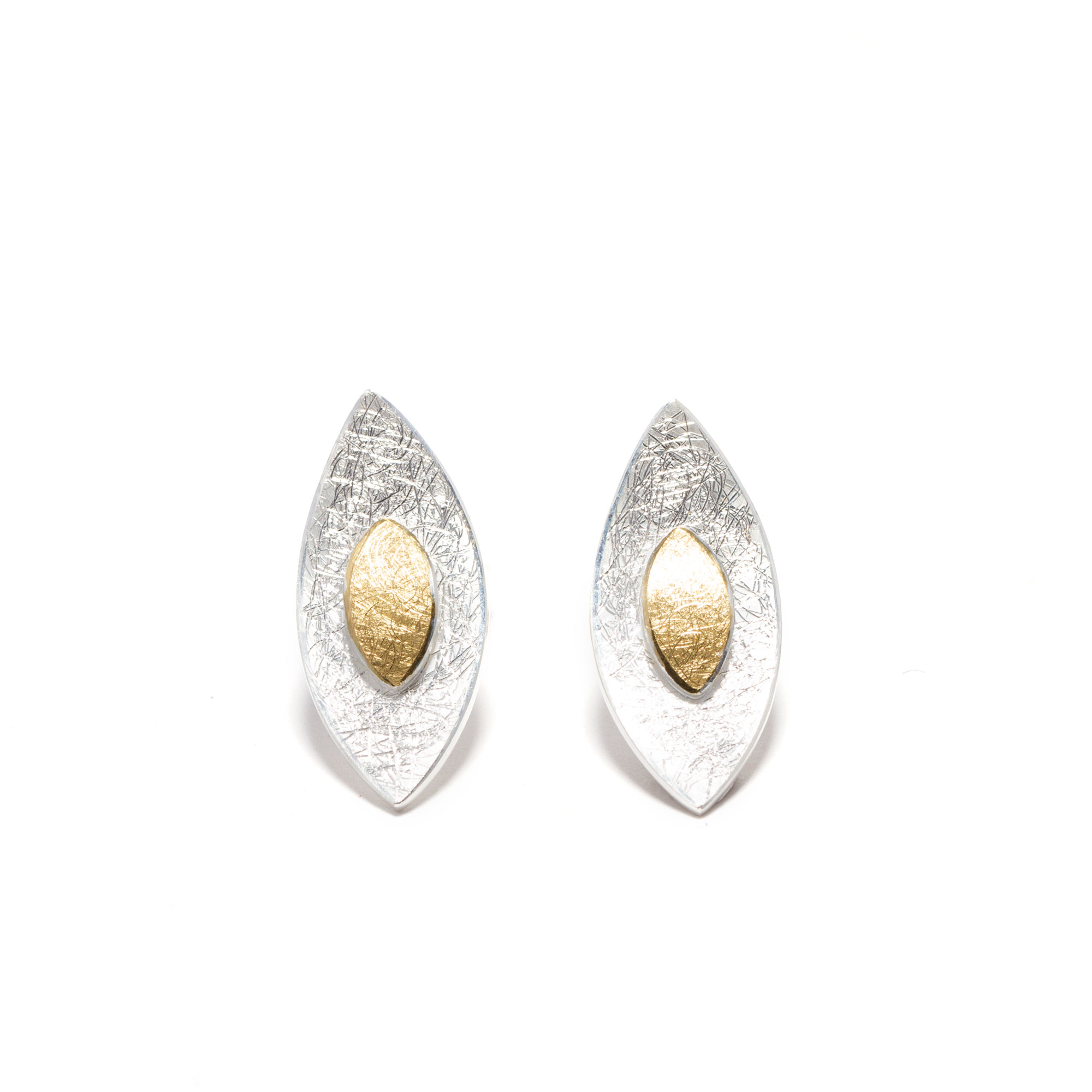 Navetteförmige, leicht konkav aufgetiefte Ohrstecker, eismatt gekratzt, mit einer Belötung aus 900er Gelbgold. Durch die Zweifarbigkeit lässt sich dieser Ohrschmuck sowohl gut mit Silber- als auch mit Goldschmuck kombinieren.