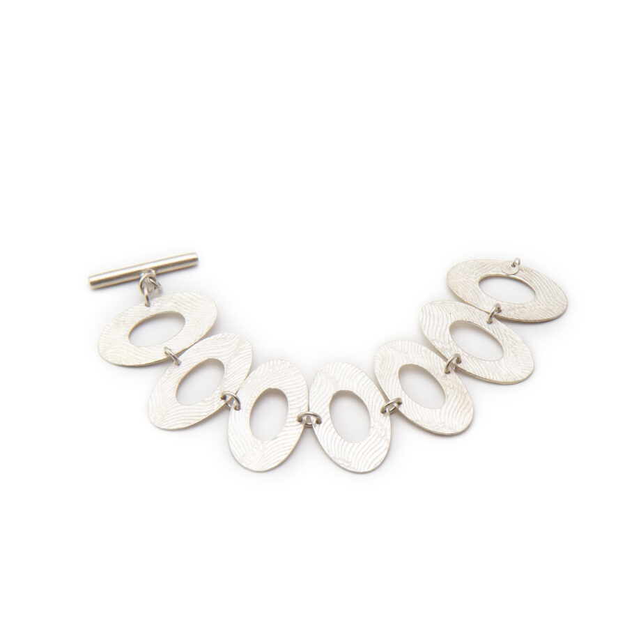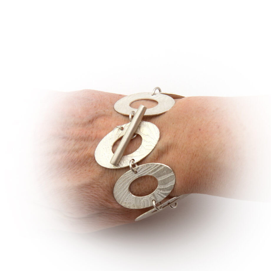 Ein außergewöhnliches, breites Armband, genau das Richtige für Liebhaber von individuellem Silberschmuck. Die Oberfläche des Silbers ist matt und unterschiedlich strukturiert. Die im selben Stil gearbeitete Knebelschließe ist ein dekorativer Hingucker, lässt sich auch mit einer Hand gut bedienen und ist sicher. Das Armband hat eine Länge von ca. 21 cm, die Ovale messen in der Länge ca. 43 mm.