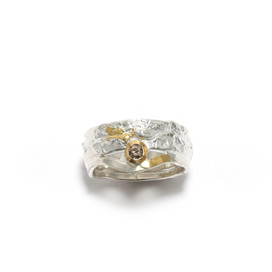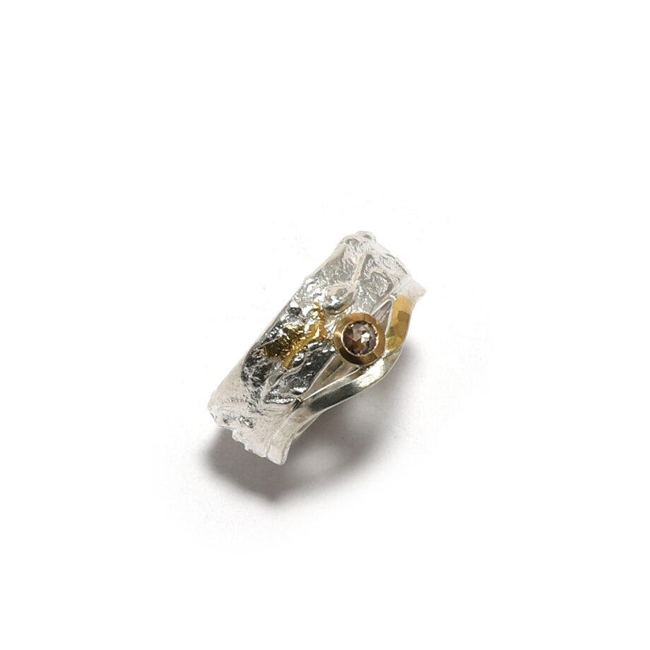Dieser außergewöhnliche Ring ist aus Sterlingsilber gearbeitet, das partiell mit 900er Gelbgold belötet wurde. Die Oberfläche des hellen Silbers ist weich und und organisch geformt, der schmalere, ca. 2 mm breite Reif, zeigt in Variation dazu einen charakteristischen Hammerschlag auf der Oberfläche. Im horizontalen Spalt trägt der Ring einen espressofarbenen Diamanten im Rosenschliff von ca. 3 mm Durchmesser und etwa 0,15ct., der in 900er Gold eingefasst wurde. Die Ringschiene ist oben etwa 11,5 mm und unten ca. 7 mm breit. Die Ringgröße entspricht etwa einer 57.
