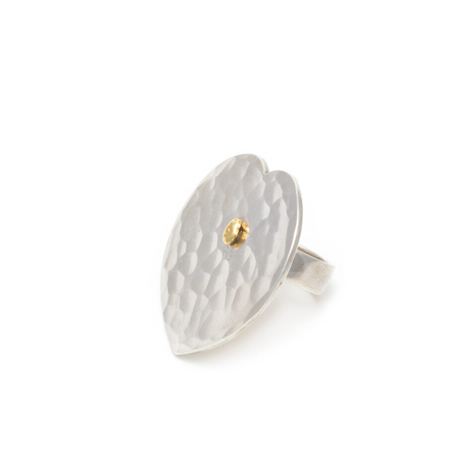 Silberring „Herzblatt“, mit Hammerschlag und Feingold