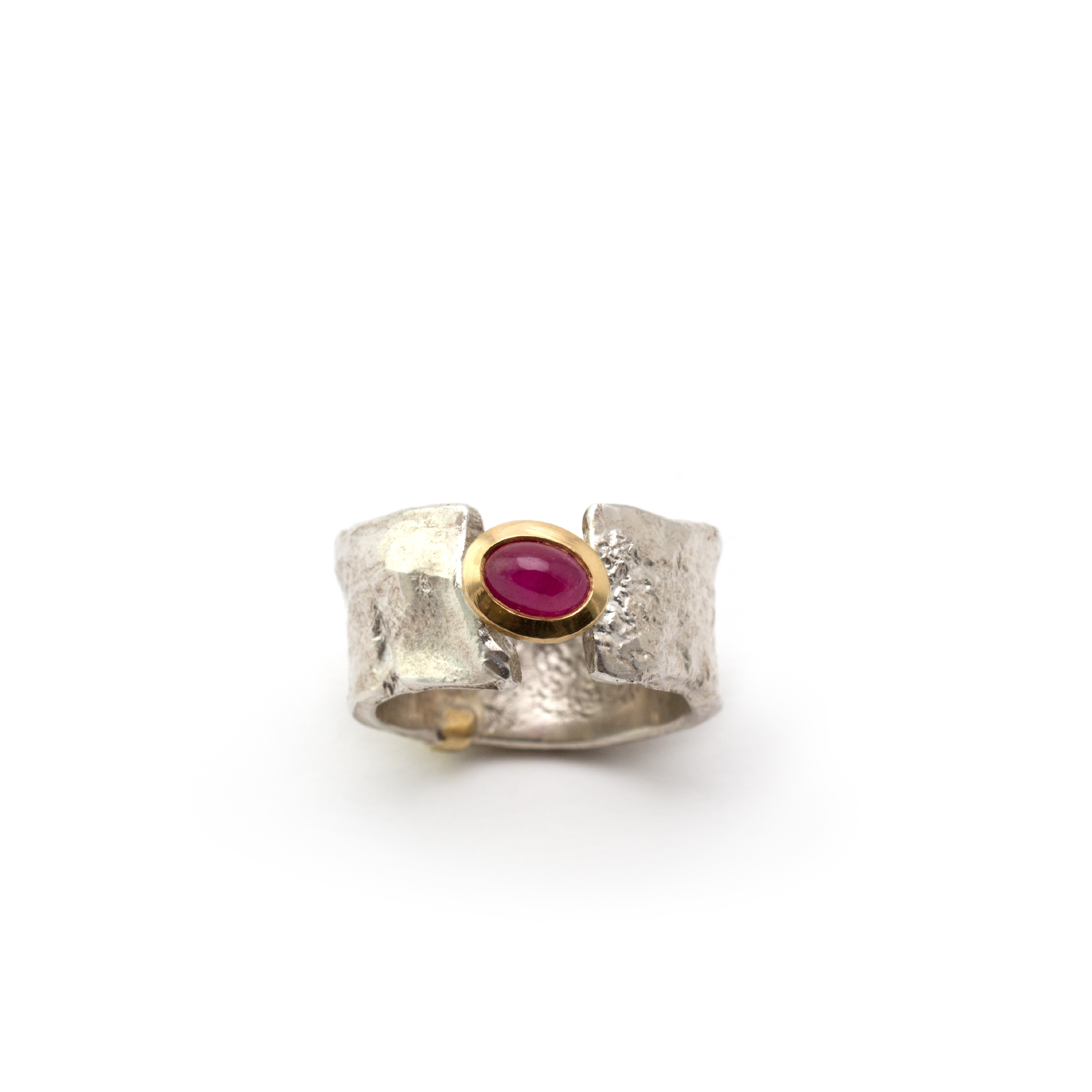 Dieser einzigartige Ring ist aus strukturiertem Sterlingsilber gearbeitet. Im mittigen Spalt trägt er einen in 750er Gelbgold gefassten ovalen Rubin im Cabochonschliff. Auf der Unterseite ist die Ringschiene mit einer Applikation, ebenfalls aus 750er Gold versehen. Der Ring ist ca. 10 mm breit und passt einer 54.