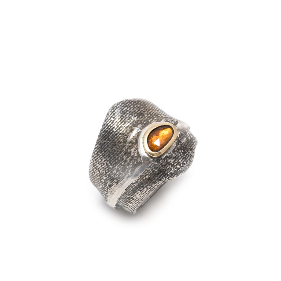 Dieser markante Ring ist im Ringkopf etwa 26 mm breit und trägt zentral einen honigfarbenen Turmalin im Rosenschliff, von etwa 9 mm x 6 mm Größe, der in 750er Gold gefasst ist und das Licht wunderschön einfängt. Die Ringschiene läuft nach unten hin auf etwa 11 mm Breite schmaler zu, was den Tragekomfort erhöht. Der Ring ist 3 – 4 mm stark und ca. 30 Gramm schwer. Das Silber hat eine Rillenstruktur die an Sandstrand und Wellen erinnert und durch Schwärzen mittels Sulfidieren hervorgehoben wird. Die Ringgröße entspricht etwa einer 55 – 56, der Innendurchmesser beträgt ca. 17,8 mm.