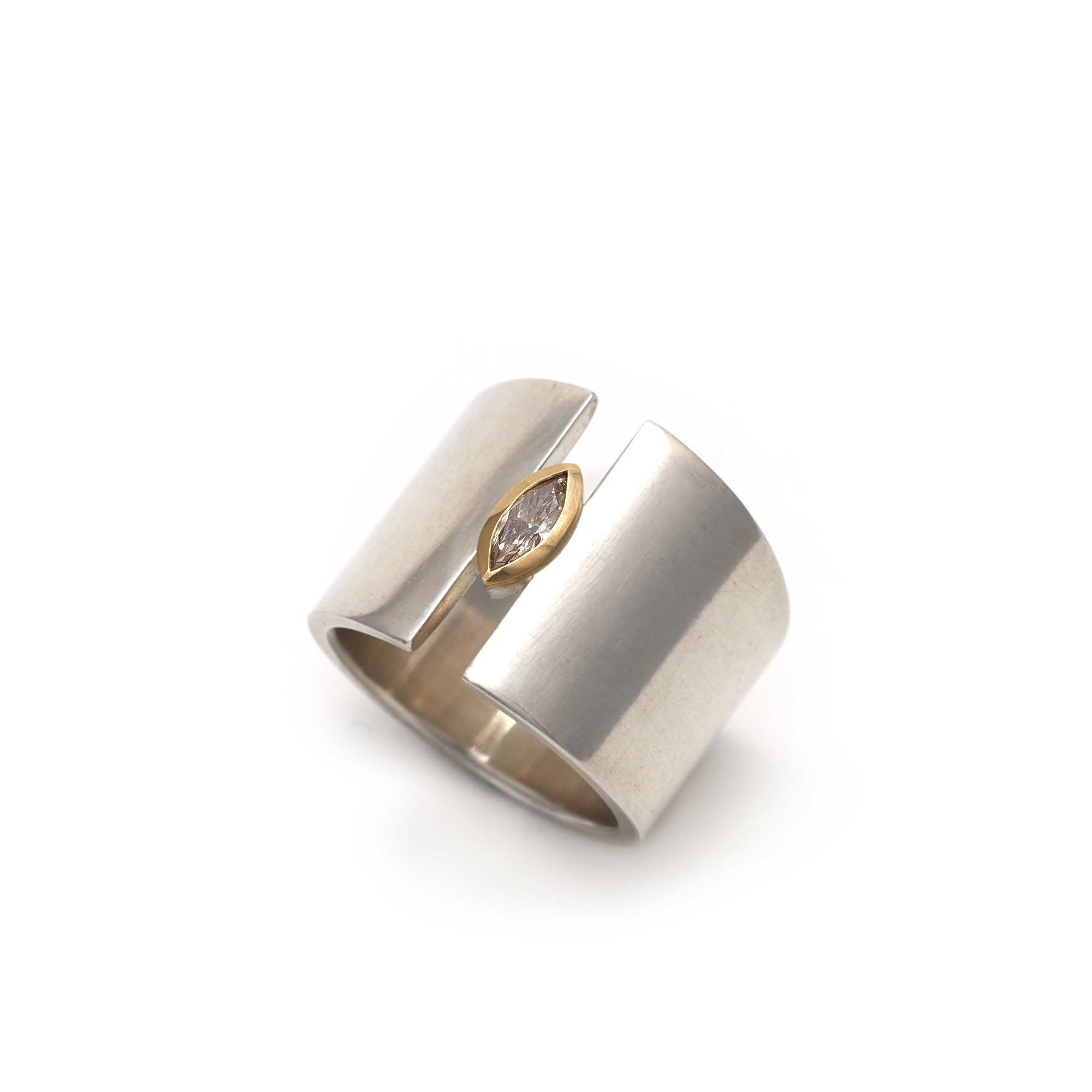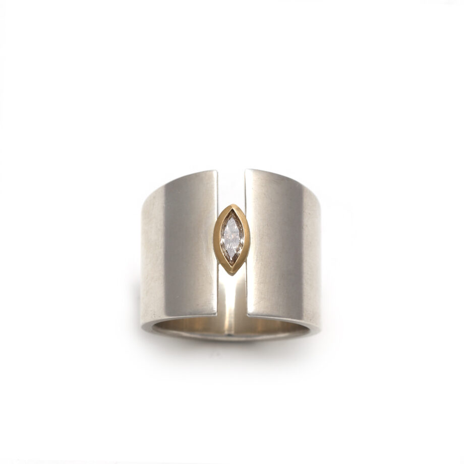 Dieser ausdrucksvolle Ring ist aus hellem Sterlingsilber gearbeitet. Im vertikalen Spalt trägt der Ring einen in 750er Gelbgold eingefassten, natürlichen champagnerfarbenen Diamanten im Navetteschliff von ca. 0,22 ct und etwa 7 mm x 3 mm. Die Ringschiene ist oben etwa 18,5 mm breit, läuft zur Handinnenseite hin auf ca. 12 mm schmaler zu und ist etwa 1,8 mm stark. Die Ringgröße entspricht mit einem Innendurchmesser von ca. 18,5 mm etwa einer 57.