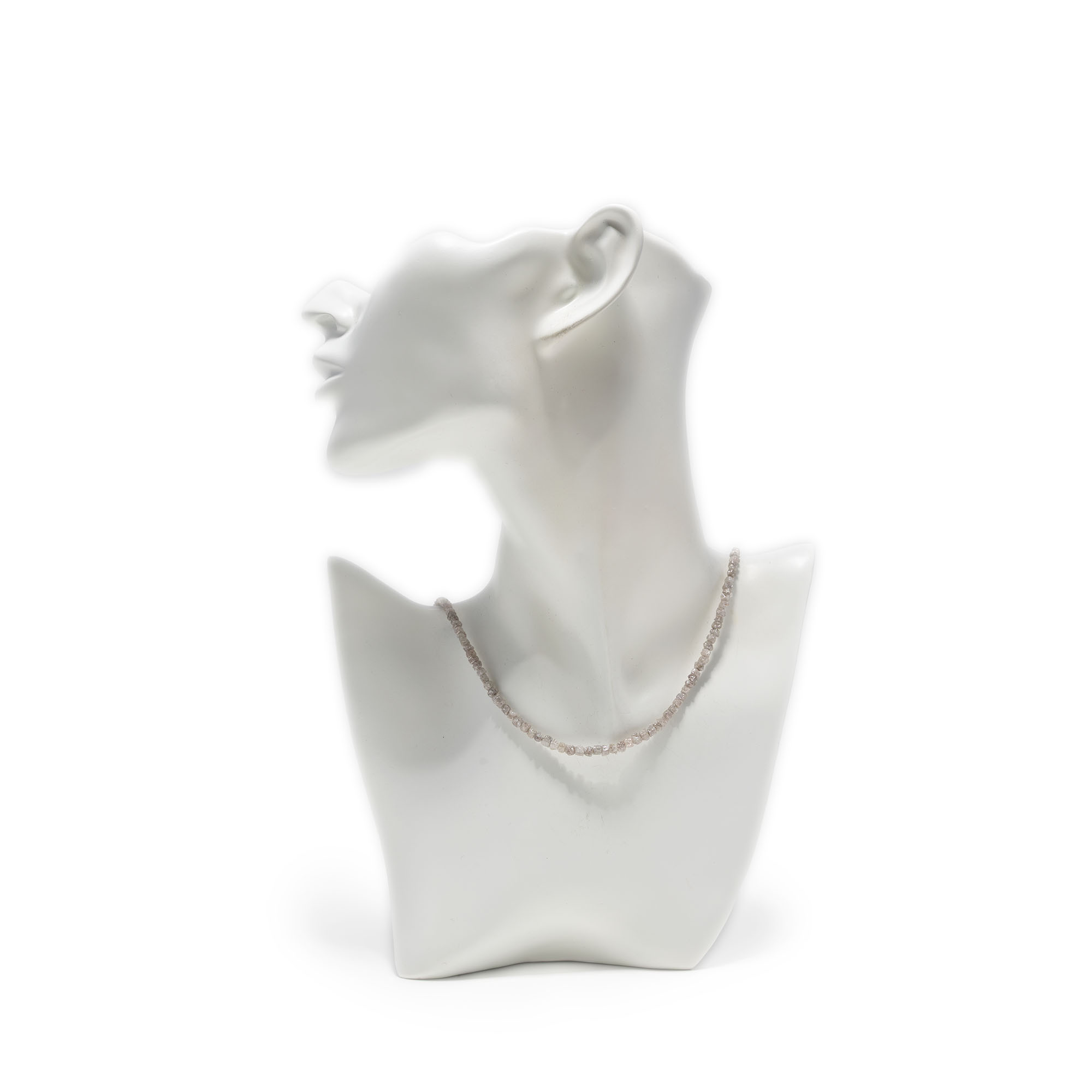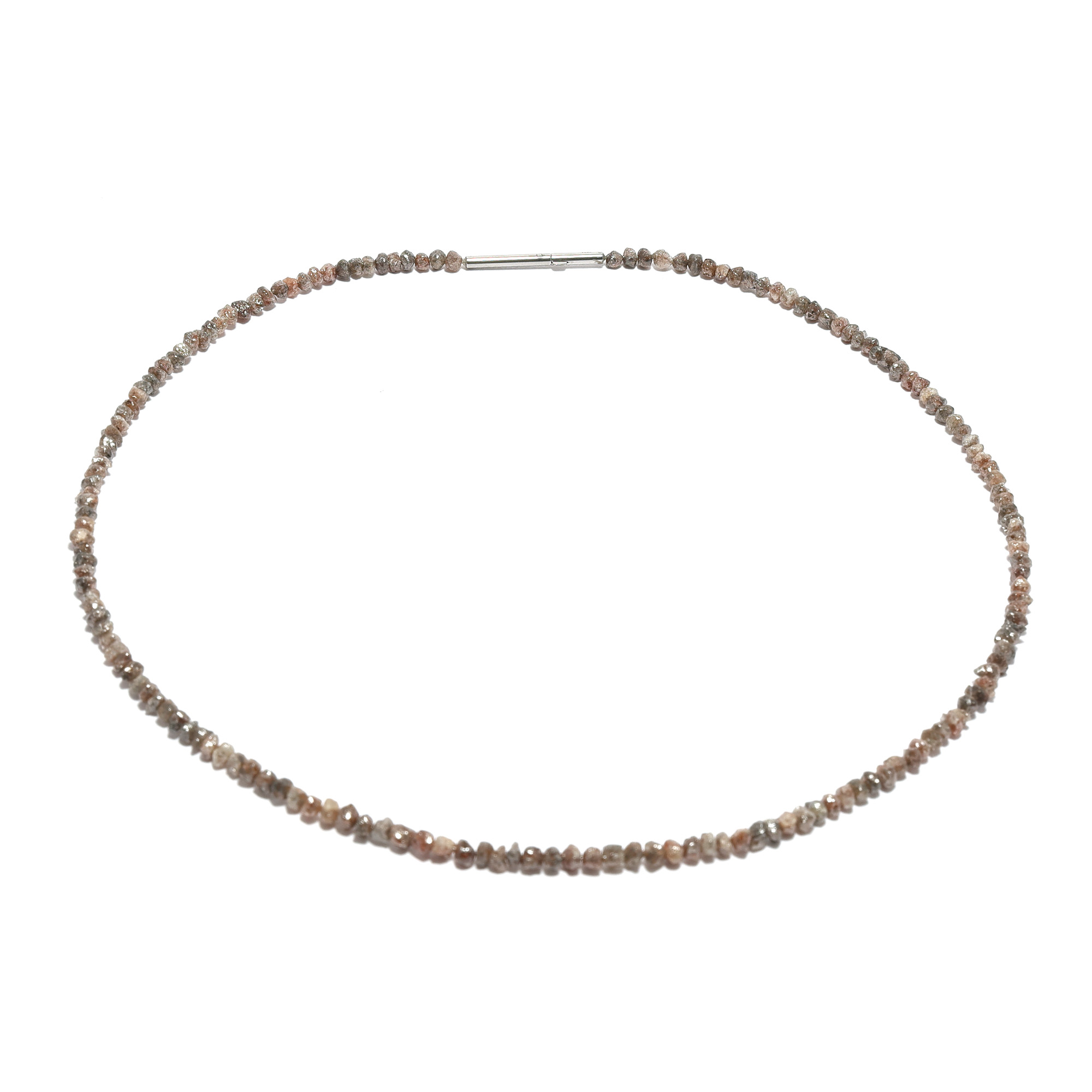 Dieses Collier besteht aus natürlichen taupefarbenen Rohdiamanten von ca. 37 ct. Die optische Wirkung der Kette ist von dezenter Hochwertigkeit. Die kristalline Oberfläche der Diamantnuggets, die etwa 3 mm – 3,5 mm messen, zeigt den typischen und unverwechselbaren Glanz des Königs der Edelsteine. Das Collier hat eine Länge von ca. 45 cm. Der Verschluss ist ein leicht zu handhabender Doppelclipverschluss aus poliertem Edelstahl. Diese Kette eignet sich auch bestens um kleine Anhänger daran zu tragen.